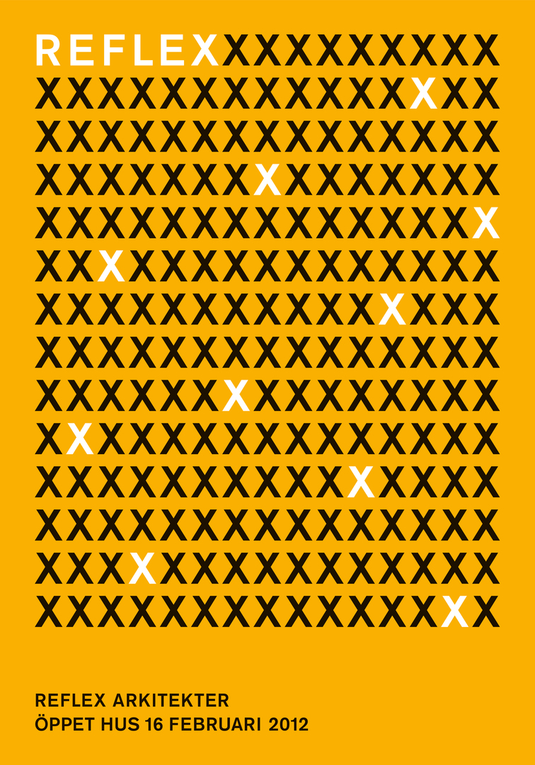 This bold orange poster for Reflex Architects is covered by the letter X laid in a cross-stitch pattern. The use of silver, as the colour of a reflex, breaks up the order as in flashes. The poster, which invites to an open house at Reflex Architects, plays with the logotype Gabor Palotai Design created for them, and matches to the graphic design made for Reflex Architects during the years.