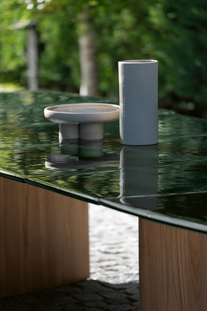 The Regaliz table was developed for luxurious outdoor dining. Its trapezium-shaped glass segments create a harmonious yet dynamic surface and allow the table to extend to lengths of up to 490 cm while maintaining its sculptural elegance. Crafted using a special melting technique, the glass top offers a rich organic texture that interacts beautifully with light and creates a special depth effect. It is available in the colours dark green, dark brown and pebble. With its two teak bases, Regaliz combines a bold presence with refined details.