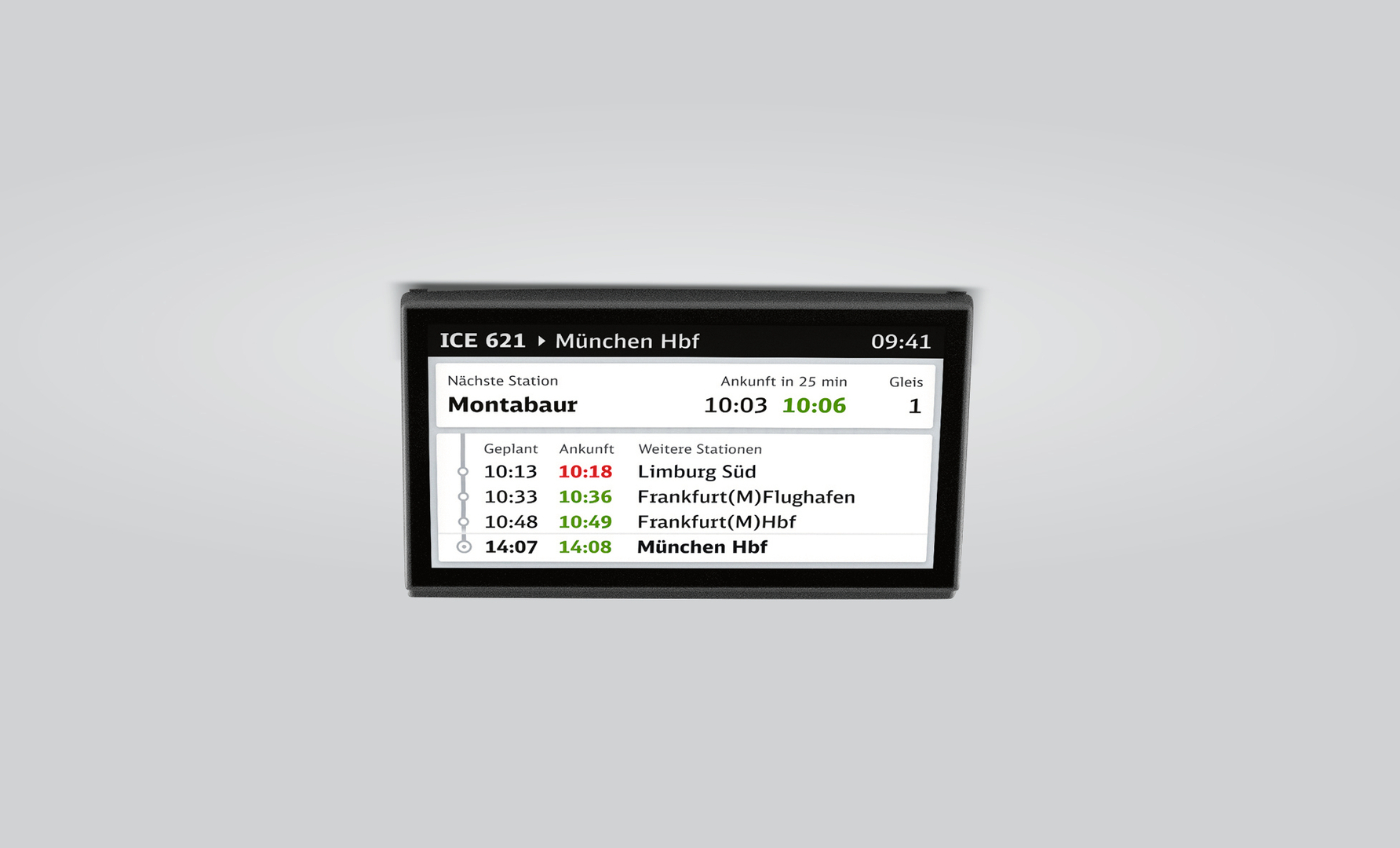 The passenger information displays on the Deutsche Bahn long-distance trains are a central source of information for travellers. The new screen design was developed with the aim to enable all customers to have a relaxed journey and to provide them with the latest information in a clearly arranged and precisely tailored manner. Against a backdrop featuring a clear appearance and a modularly arranged tile design, an intelligent layout presents information depending on the respective travel situation, so that passengers have the most relevant information at their fingertips at all times.