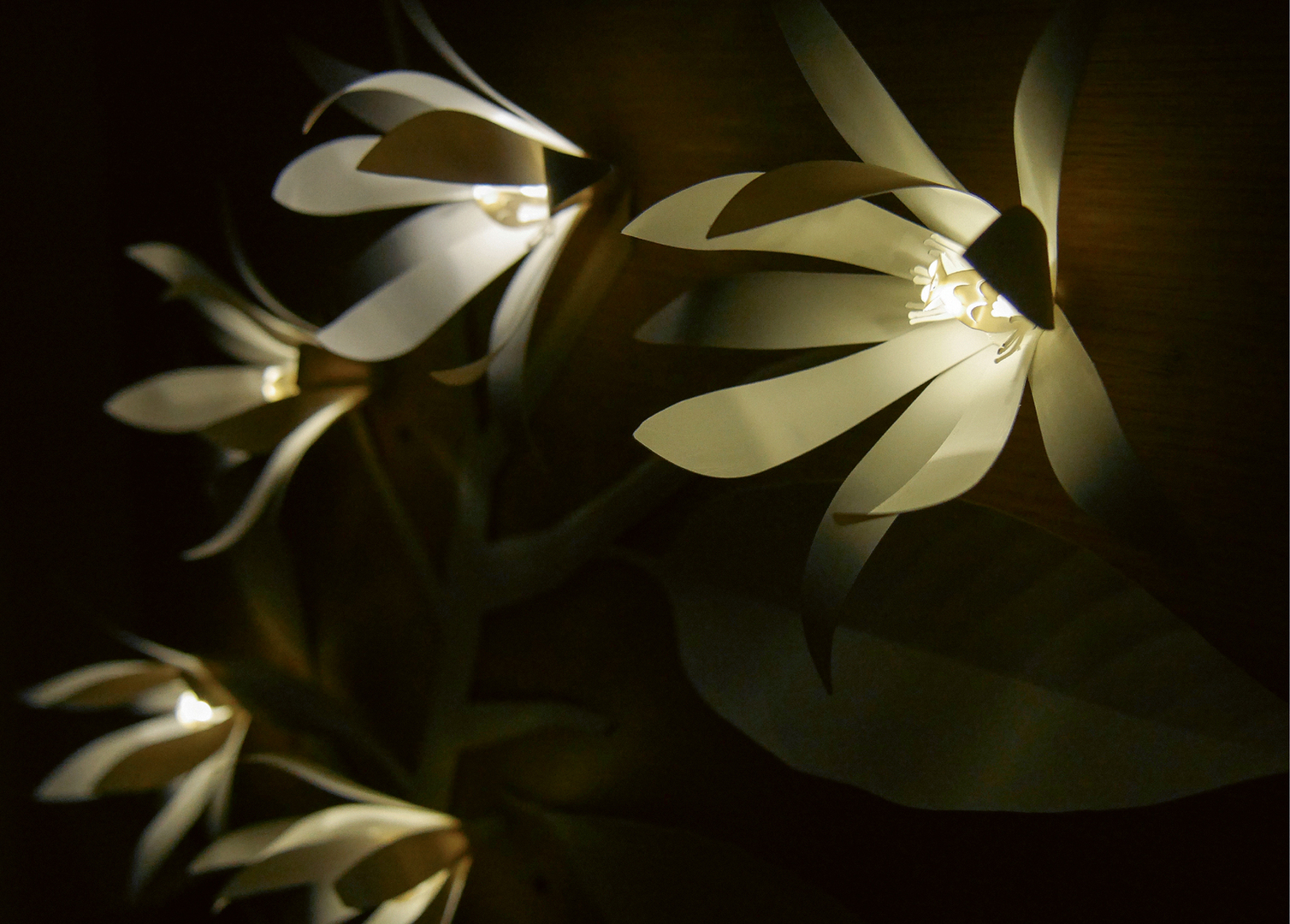 With the concept of bringing different sensory experiences to an audience, the design of this device aims to document “Taiwan’s flowers, fragrance and memory”. Three kinds of flowers were selected by the Taiwanese people themselves as being the most representative of Taiwan. In addition, people’s memories and stories about the flowers were also collected. The overall device is a 245 × 180 cm darkroom, three walls of which feature interactive paper sculpture devices on the theme of plum blossoms, magnolias and Phalaenopsis, allowing users to freely experience three kinds of interactions.