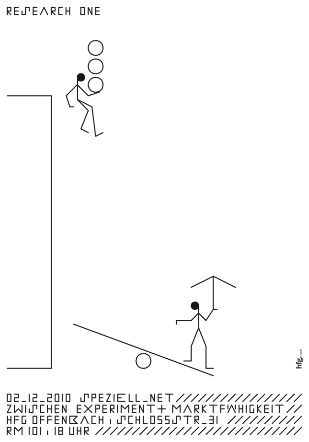 The poster series Research announces six lectures held at the Academy of Art and Design Offenbach by communication designers on the topic of design research and its different approaches. The posters show stick figure illustrations of simple and reduced design to create an imagery that reflects at a glance the different hypotheses and individual theories. These ironic and inventive sketches – such as the one on the topic of “Vorglühen, Aufglühen, Verglühen!” (“Pre-heat, glow, burn!”), which shows one stick figure trying to give a light to another but producing a huge flame instead – aim at raising curiosity and interest. The colours of black and white suffice to spark the vivid imagination of the viewer and direct the attention to information presented in an equally minimalist design on the bottom edge of the posters.