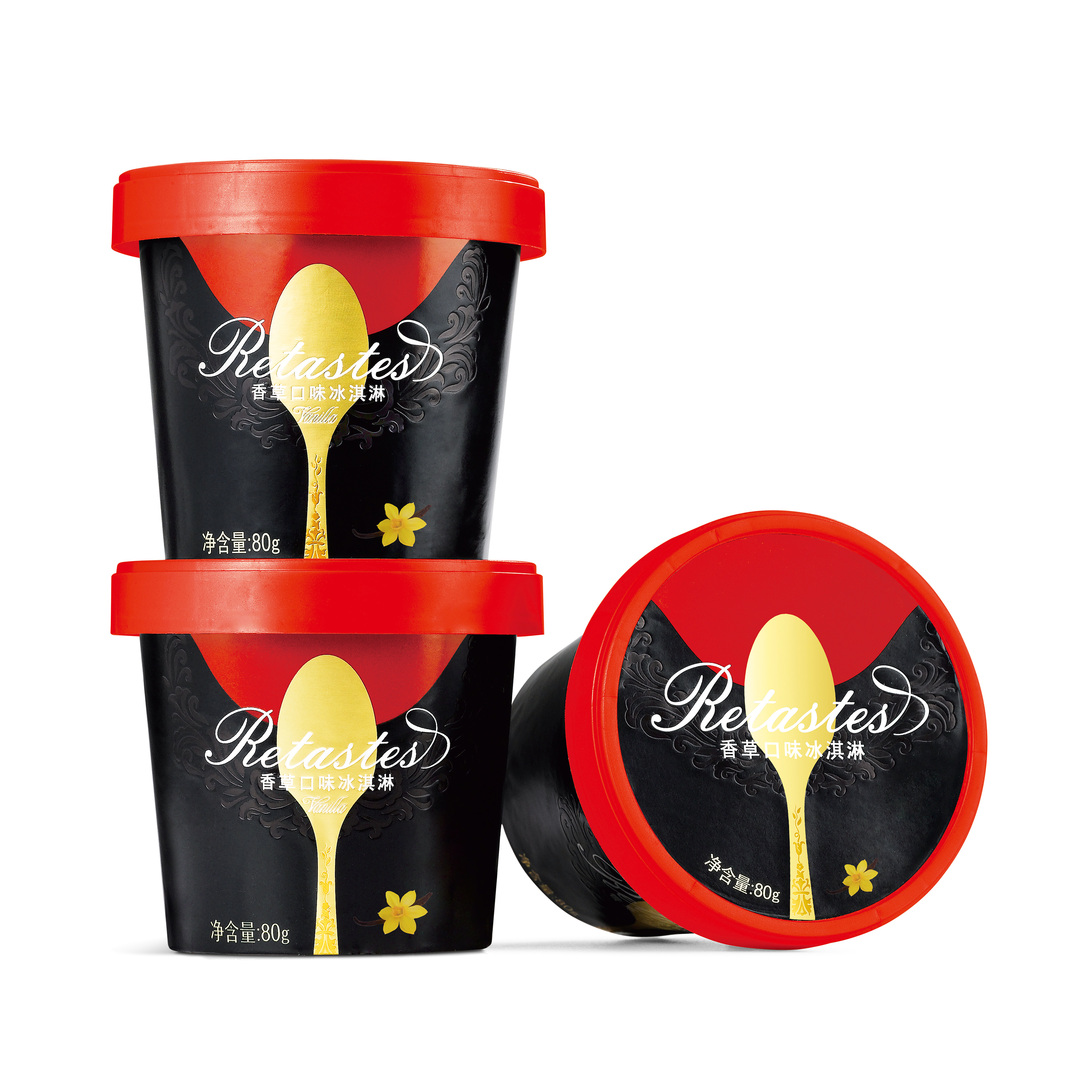 Retastes is a premium ice cream brand with a packaging design that focuses on the pleasurable consumption of ice cream. The abstract key visual shows a golden spoon, which is being licked by a red tongue. The high-contrast colours of red and gold against a black background render a distinctive overall image, which has an eye-catching ef- fect at the point of sale. An elaborate flower tendril on the spoon handle, which is also embossed in the matt carton around the logo, fosters a premium impression that is haptically appealing at the same time.