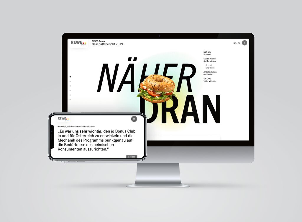 REWE Group’s 2019 annual report titled “At your side – despite the distance” provides information about the economic key figures of the business year, the milestones of the year, and contains an entertaining magazine. The core focus is on communicating how closely the business of this cooperative company is connected to the lives of people in both Germany and other European markets. The layout of the report, which is published exclusively online, includes animations that create a sense of three-dimensionality, emphasising the title of the report. Several videos provide additional information.
