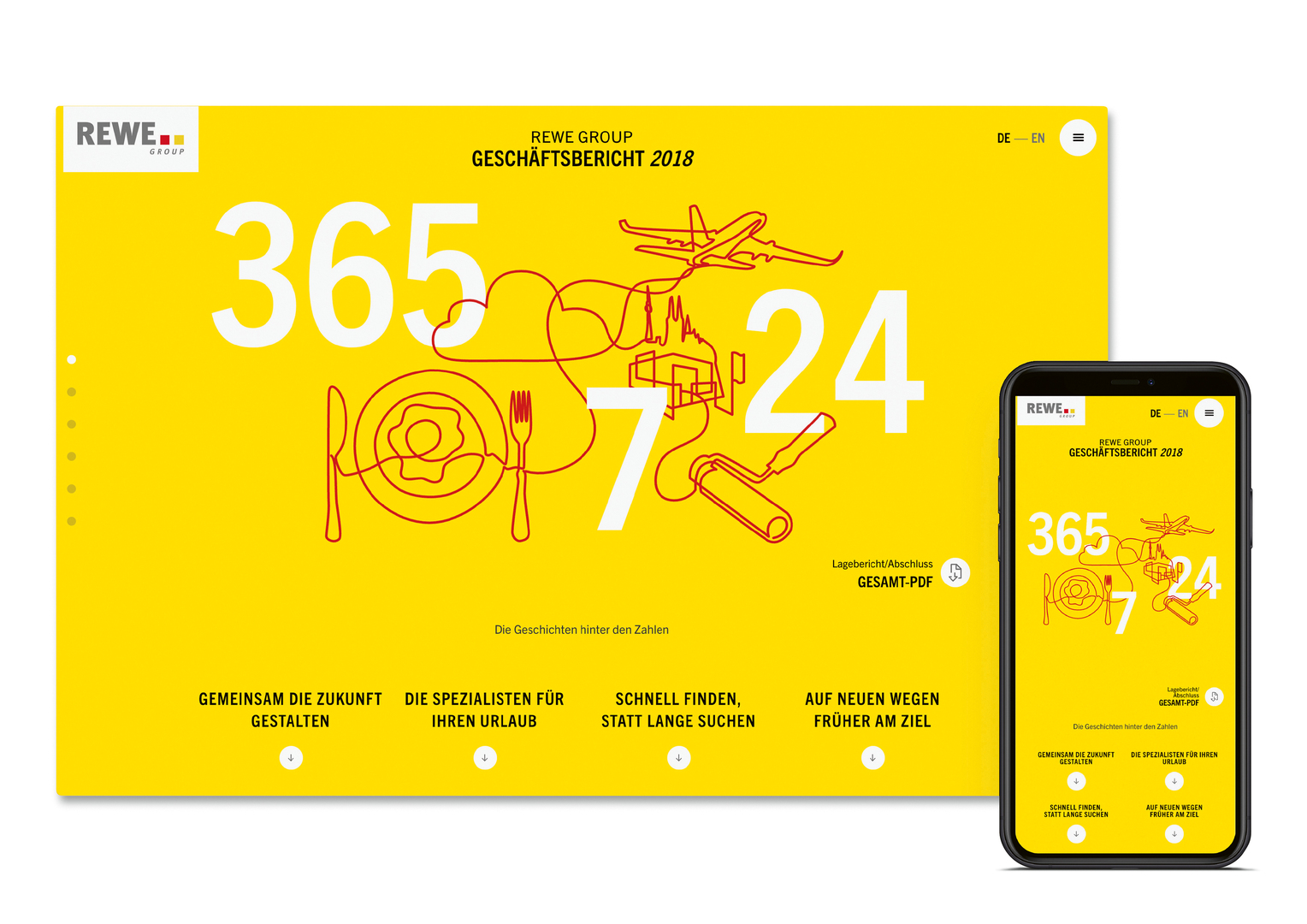 REWE Group’s online annual report for 2018, entitled “365-7-24”, contains key economic figures, the milestones of the year and general information about the company, as well as an entertaining magazine that includes a few stories behind the numbers. They show both the customer focus and the high service demands of the retail group in an exemplary manner, while the image language piques the reader’s curiosity. Animated elements and a parallax effect on the report’s website support the visual storytelling. Bold key figures and video contributions in the exclusively digital annual report provide additional information.