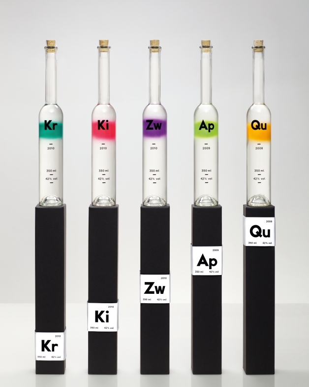 “Reduction to the essentials” is the main theme of this packaging design for fruit spirits. It is inspired by the distillation process, during which the fruits are reduced to the essence of their flavours. As a metaphor for pure elements, the abbreviations on the bottles make reference to the periodic table in a special way: for example, “Ap” stands for “Apfel” (apple) or “Zw” for “Zwetschgen” (plum). Further design features, such as the paper band on India paper, likewise refer to the thematic context. Employing very simple technical means, the product nevertheless evokes an impression of ultimate value and exclusivity.