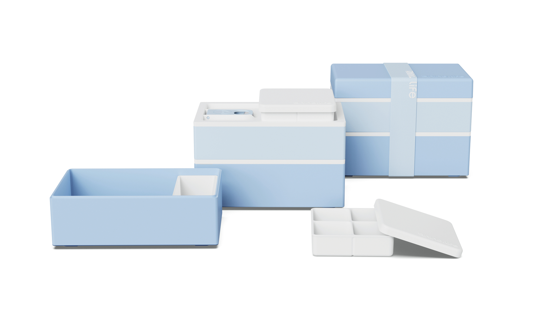 The Rhino.life lunch box consists of several containers and is designed to make carrying food more convenient. An air valve and a silicone seal ensure that every container is air-tight and leak-proof. The two stackable boxes are held together by a highly elastic band for compact storage. Smaller, well-sealed containers provide additional storage for sauces and spices. Made from PBT plastic, the containers can be heated in a microwave or water bath.