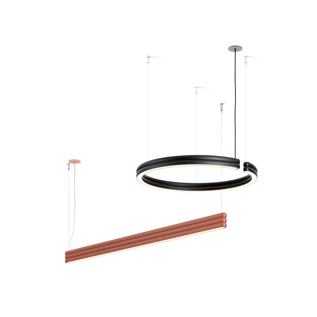 The hanging lamps of the RIBBY collection, with their decidedly oversized shapes, were heavily influenced by the Memphis style. As interesting visual accents, they break with minimalist conventions. The collection’s round and straight pendant luminaires are available in a range of sizes and colours for compatibility with various lighting scenarios in private or public interiors. In spite of its slim shape, the matt diffusor provides a high light output. The luminaires all come with a durable light source and replaceable components.