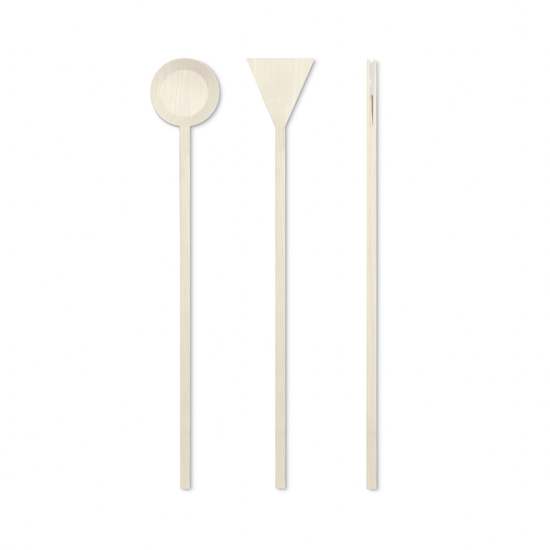 The kitchen utensils of the Wood for Food collection are made of solid hard maple wood. The robust wood comes from a Slovenian forest area and lends the products an appealingly bright hue. The spoon as well as the spatula and the fork feature a geometrical form and are equipped with a hidden magnet, allowing users to either mount them to a metal surface or easily store them together as a compact set.