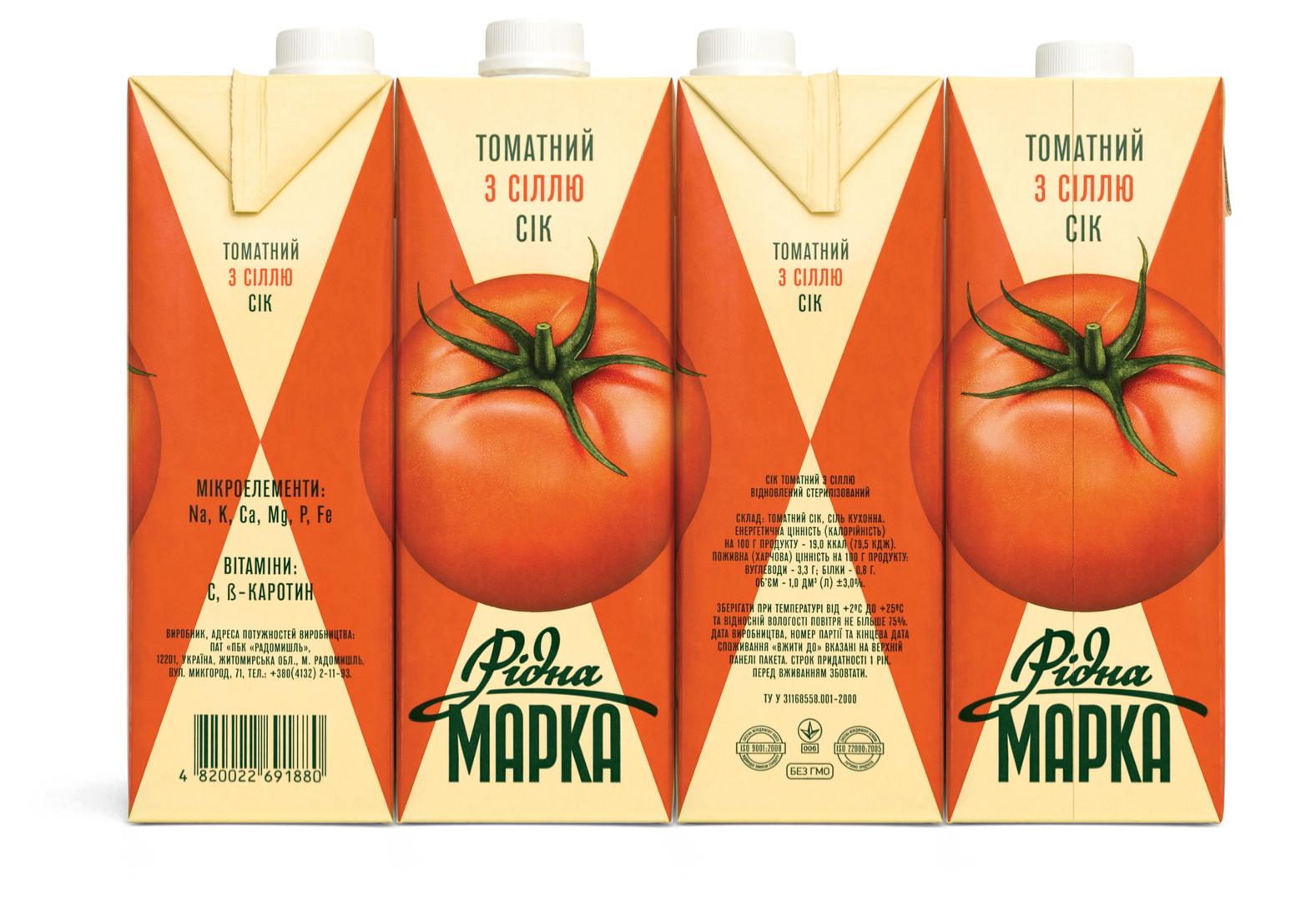 Ridna Marka is a new Ukrainian juice line comprising four basic flavours: tomato, clear apple, orange and cloudy apple. The inspiration for the packaging design, as well as for the brand name, which means “native brand” in Ukrainian language, has been taken from the Soviet packaging design style of the 1960s and 1970s. The idea was to recreate this look and feel of grocery packaging from the USSR and thus evoke a sense of childhood nostalgia among the older generation, but at the same time avoid any reference to the ideological component of those times. Instead, the chosen retro design stands for quality and taste.