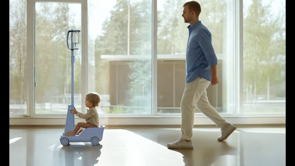 Ringo is a motorised IV mobility device that is safer for children than standard IV stands in hospitals. It employs infrared sensors and a camera to detect and avoid obstacles, while the IV bag holder keeps the tubes from tangling. Ringo enables children to explore independently while providing parents peace of mind. A remote control allows parents to respond in emergencies.