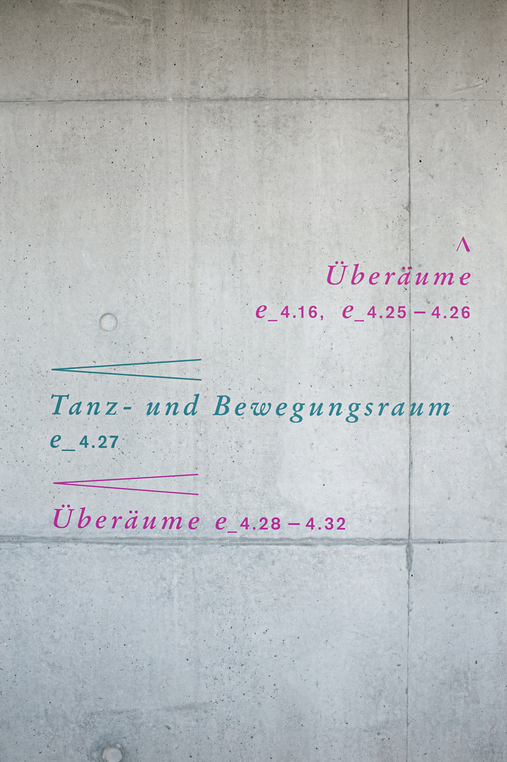 The orientation system for the new building at the Robert Schumann Musikhochschule Düsseldorf effectively guides users and visitors to their respective destination. Colour coding is used to distinguish between the various types of usage areas. In order to indicate directions, the system employs two arrow elements borrowed from music notation, as befits a conservatoire. The crescendo sign shows directions, pointing either left or right. Where the path leads straight ahead, the marcato sign stands aligned to the left or right above the name of the room. All the waymarks consist of plotted notation applied directly to exposed concrete or other substrates.