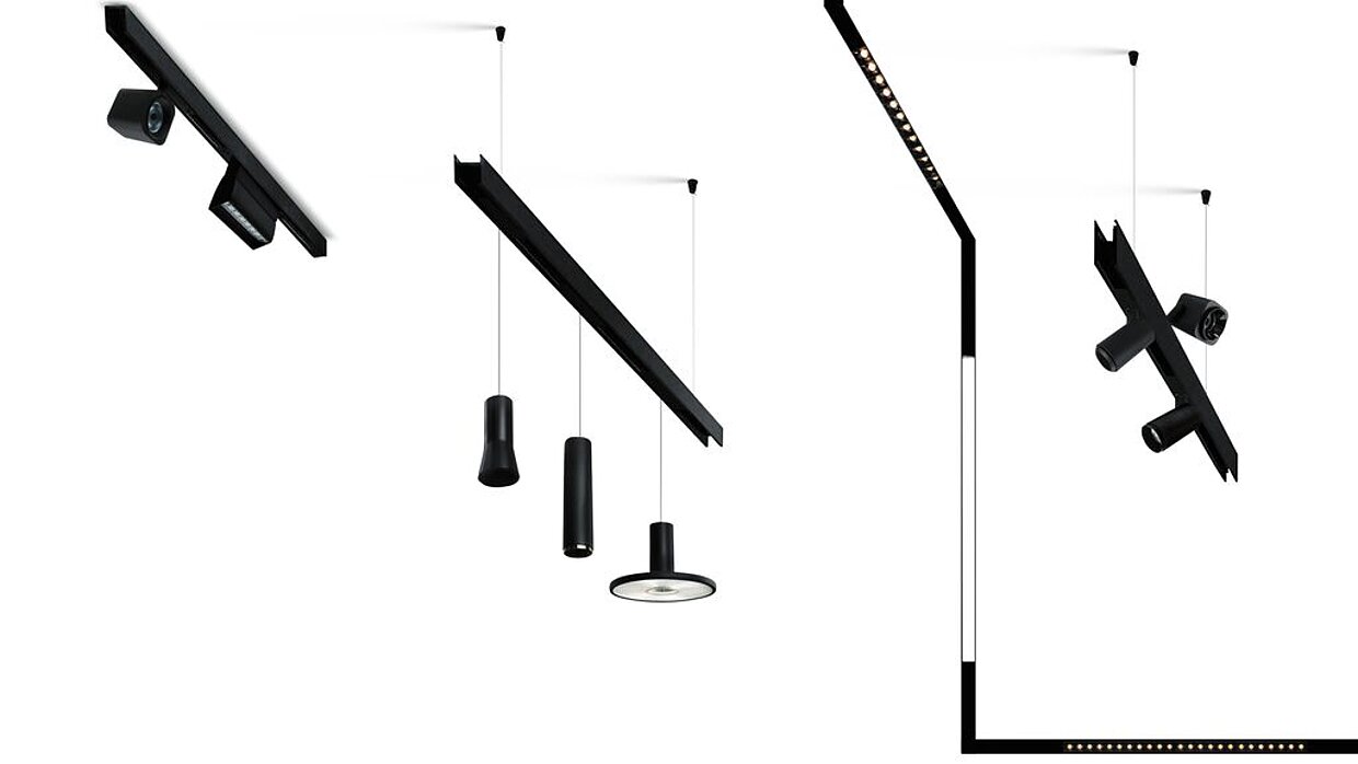 Clear lines emphasise the functional quality of this noiseless motorised retail lighting in an appealing manner.