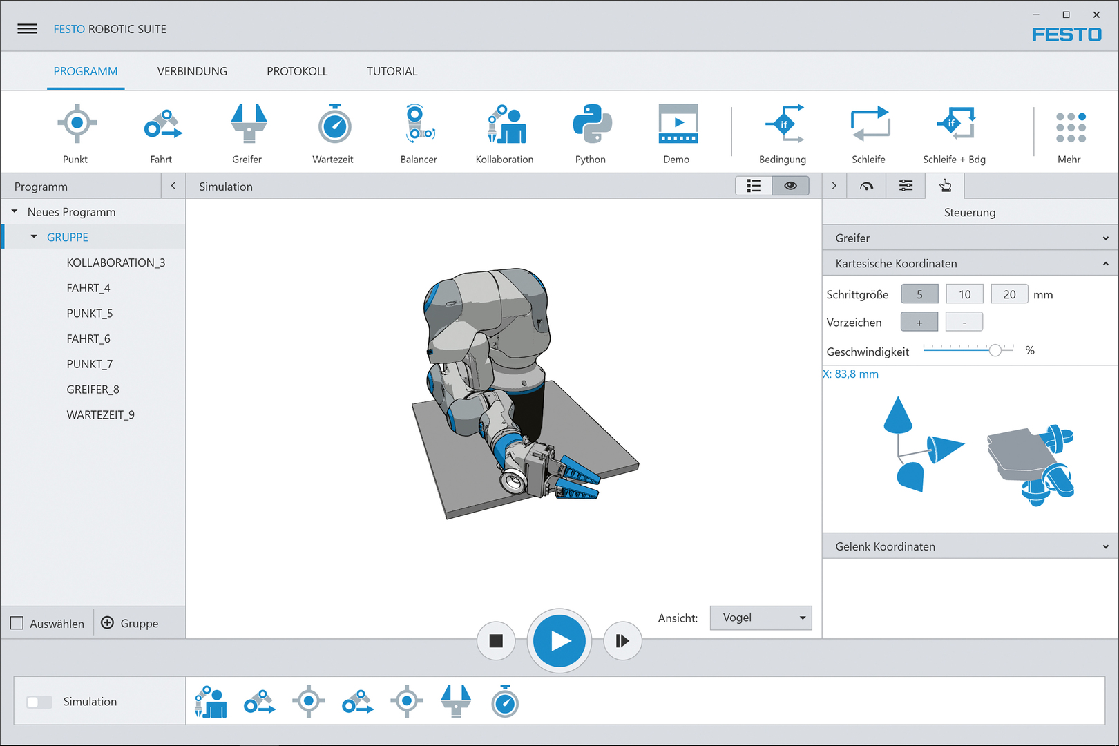 Based on a smart concept, the design of this user interface succeeds in visually representing the operation of the highly complex robot arm BionicCobot in an intuitive and self-explanatory manner. The graphics and icons designed for this purpose are very clear. They offer convenient drag-and-drop programming and, at the same time, the option of visualising what has just been entered – an overall convincing, well-thought-out solution.