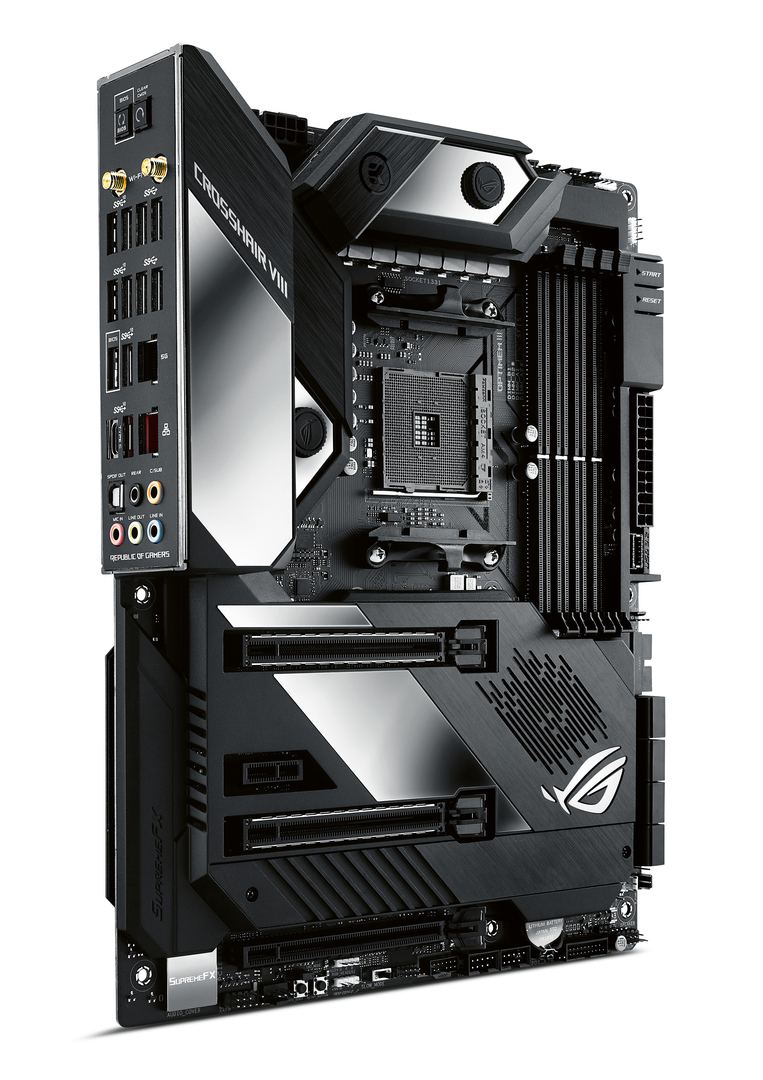 The ROG Crosshair VIII Formula motherboard offers numerous improvements over the previous model, such as NVCM-coated plating and the CrossChill VRM cooler for quiet cooling at a high capacity. The robust M.2 heat sink is ready for two powerful drives. The processor’s power supply circuit is laid out to supply all cores of the AMD 3000 series. Also on board are an Aura Sync lighting control, a 1.3" OLED display, 5G LAN, Wi-Fi and Bluetooth 5.0.