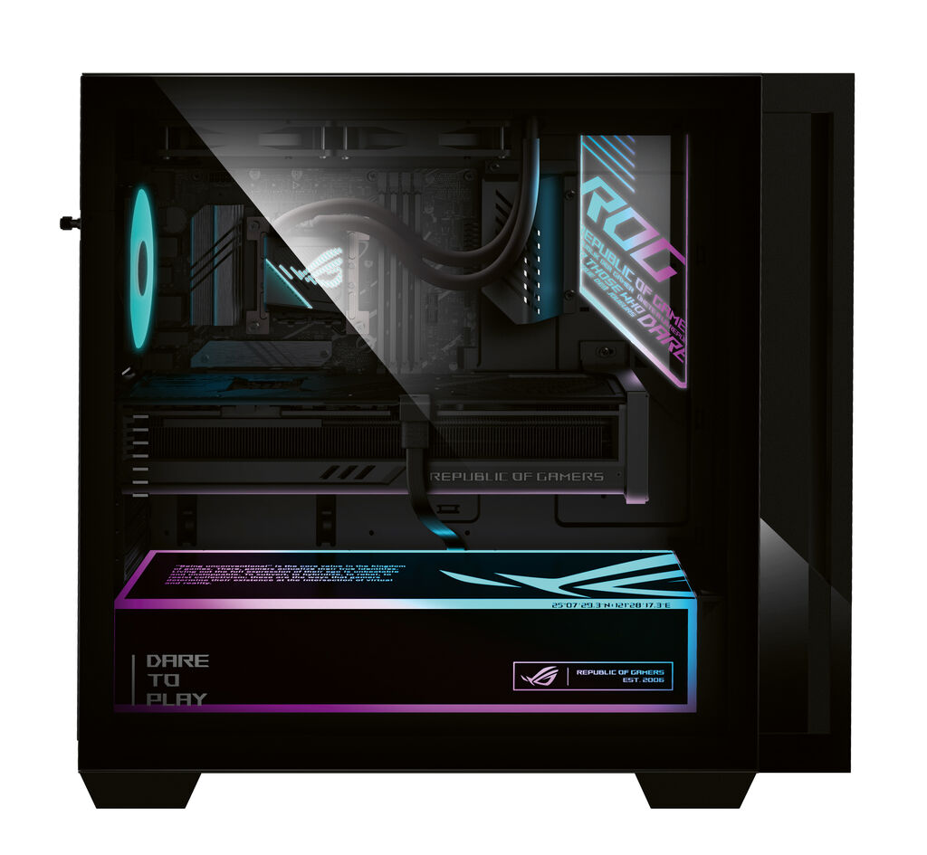 The powerful computer “ROG G700” was developed for demanding gamers. The glass, metal and plastic casing features a seamless front panel without drill holes and a side ventilation, which is also a style-defining element. Glass side panels showcase the internal hardware and the 3D RGB lighting system, which can be synchronised with peripheral devices. The durable frame is made of injection-moulded metal with a scratch-resistant powder coating.