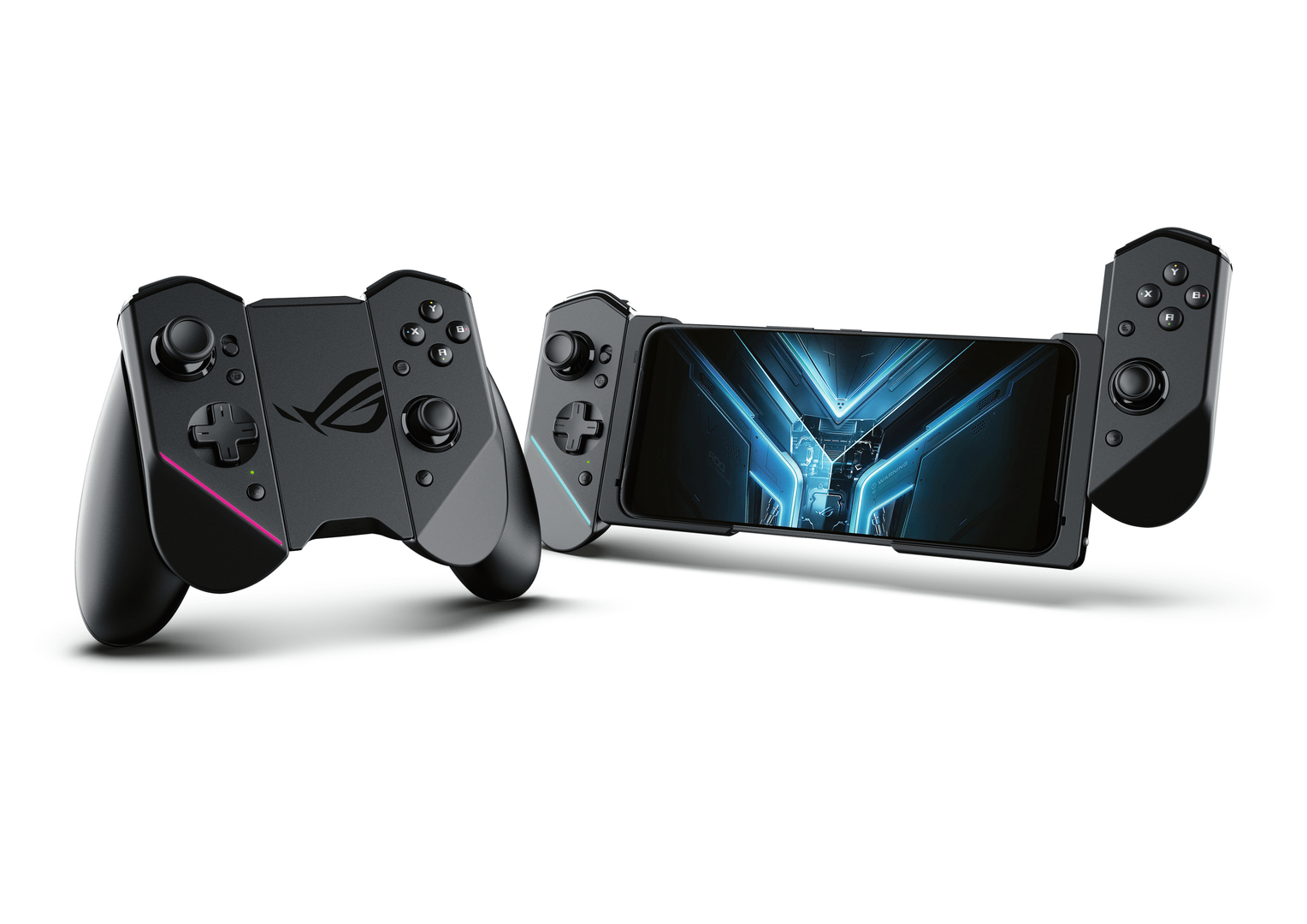 The ROG Kunai 3 Gamepad consists of a bumper, two controllers, a charger and a handle. For handheld mode, the bumper and controller are attached to the ROG Phone 3. The game content is then played on the smartphone display. Alternatively, the controllers can be plugged directly into the charger, in which case the smartphone also serves as a screen but does not have to be held in the hand. Moreover, in this scenario the handle can be mounted for the console mode.
