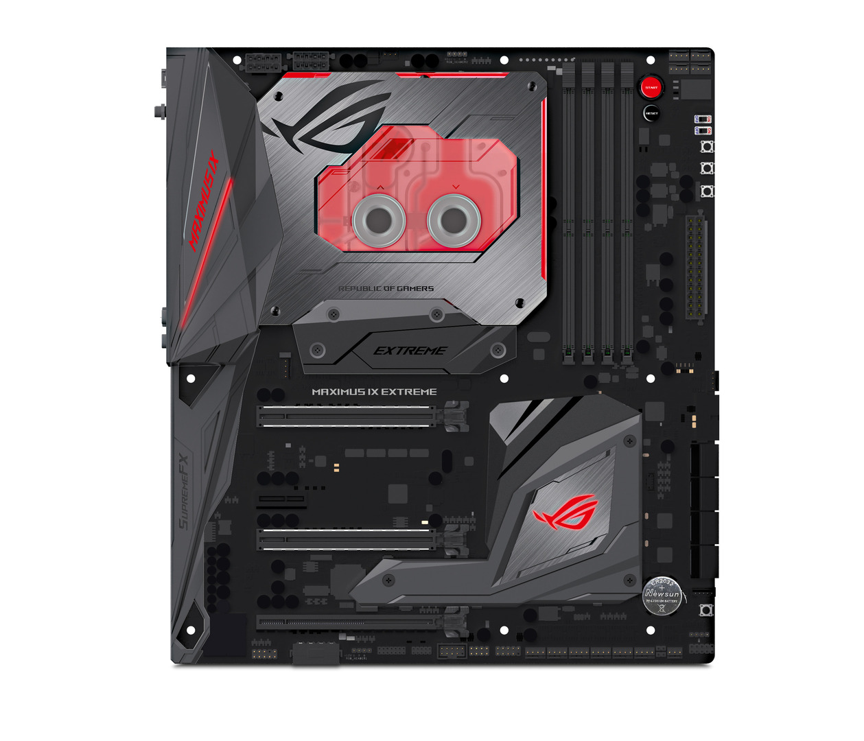The ROG Maximus IX Extreme was developed for people who often require the use of their PC at high performance for very long periods, in particular for playing computer games. In such cases, an additional water-cooling system is installed, whereby compatibility with the motherboard is usually difficult to attain. This device is a motherboard with integrated water cooler, which efficiently supports the main processor in heat dissipation. Water flow, temperature and the leakage identification sensor assist in making the performance of the motherboard easier to control. The asymmetrical design blends in well with the image world of the target group.