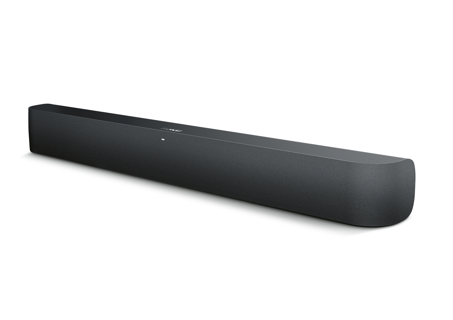 The Roku smart soundbar unites a streaming player and four speakers in a low-profile casing that can be easily placed beneath a television. It features characteristic curves that integrate with the contoured, fabric-covered speaker grille. There is a single LED shining under the fabric to indicate communication with the remote control. The back of the casing has a seamless surface in a matt charcoal finish.