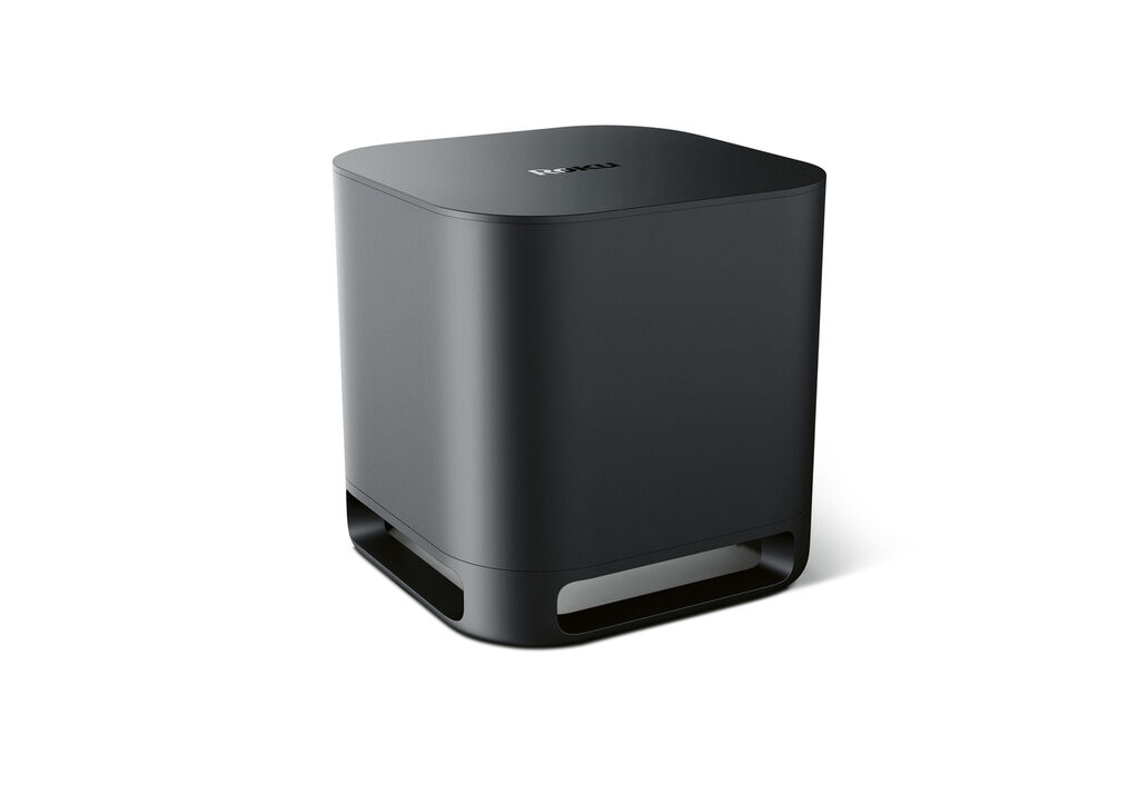 Modern flat-screen televisions are rarely able to produce deep bass tones. Combined with Roku speakers or the Roku soundbar, the subwoofer offers a solution by connecting wirelessly with these devices to deliver the accompanying audio. It has a rounded cuboid profile with laminated surfaces in anthracite colouring and an open base that ensures the necessary air circulation for the 10" speaker, which faces downward. The discreetly attached rubber feet create a non-slip stand.