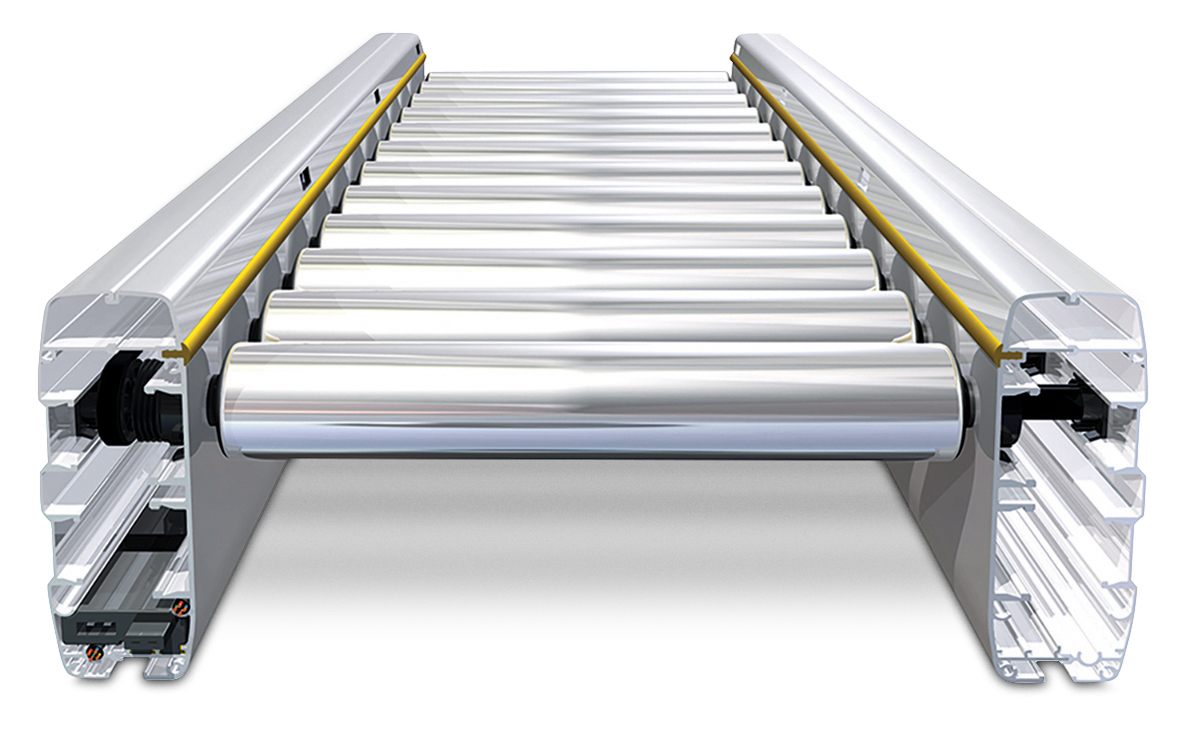 This roller and belt conveyor system is divided into separate zones, which can be operated independently. The decentralised control system ensures smooth operation when transporting goods and is particularly energy-saving. The system is controlled via a manufacturer-independent fieldbus system. All drives and control elements are integrated into the aluminium profile frame. The system can be assembled and installed without tools.