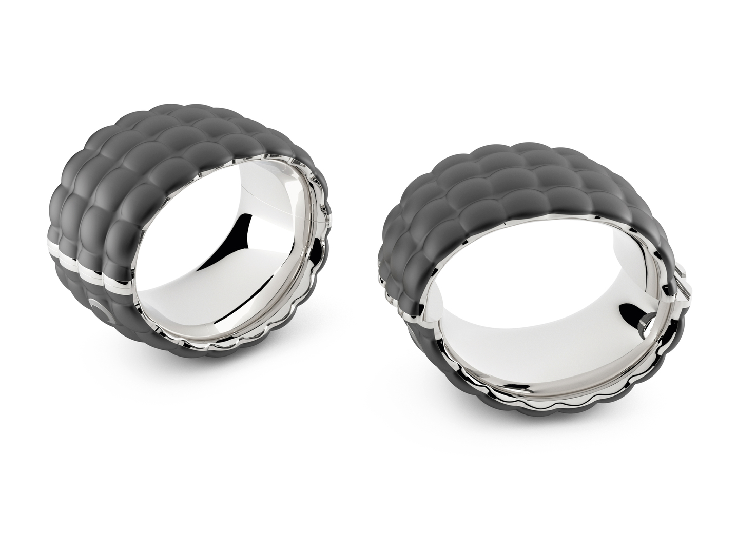 The Romy bangle combines the simplicity of graphite with the noblesse of diamonds, for the black upper layer of diamond-like carbon offers extreme hardness as well as a low friction coefficient. The coating is created by vapour depositing carbon atoms onto the surface. This process is completely ecologically compatible and guarantees what is otherwise not attainable with noble metals: scratch-resistance of the jewellery. In addition, a special diagonally sliding lock and release mechanism was developed, which is easy to operate. The oval shape perfectly adjusts to the anatomy of the wrist.