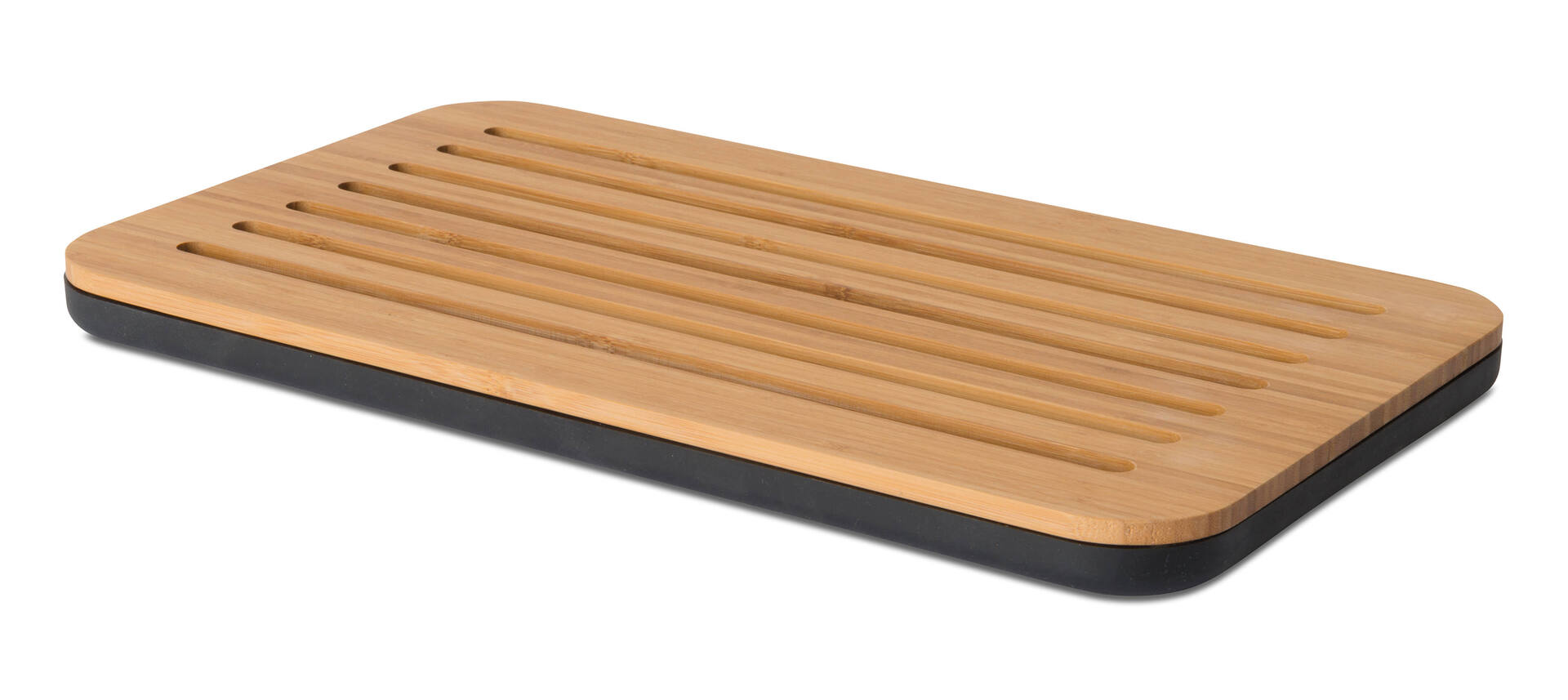 This multifunctional cutting board is suitable for slicing, cutting or serving all kinds of bread or pastries. It furthermore contains a removable bread crumb tray with a food-safe plastic surface for easy cleaning. Its lower side has a nonslip surface, lending the product stability. The top-side cutting board is made of natural varnished bamboo, which has antibacterial qualities and absorbs only little moisture.