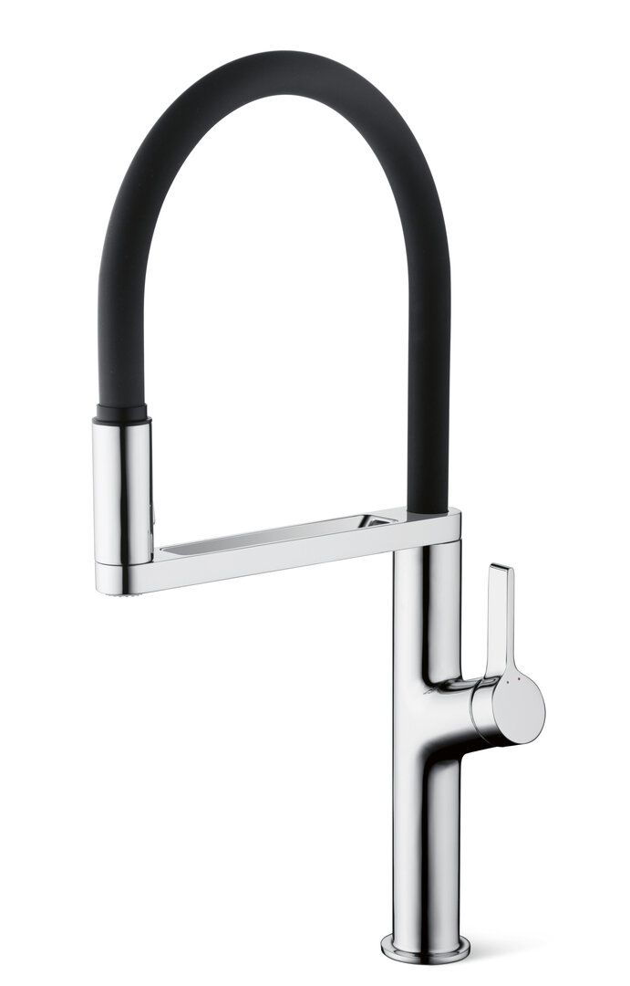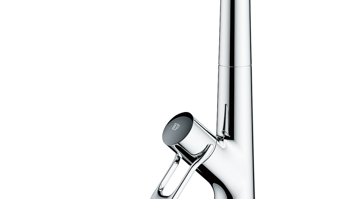 The special feature of this sensor kitchen tap is that the sensor window – as opposed to other taps – is not located at the front of the body but at the shower head holder. The holder can be swivelled around 300 degrees, so that users can control the water flow from any position by means of an infrared sensor and a simple gesture. The infrared sensor is battery-operated.