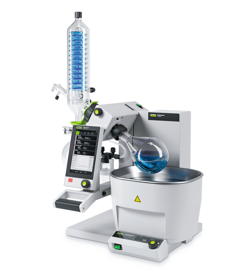 The open structure of this rotary evaporator fosters a sense of clarity. Thanks to its deliberately simple design, the components combine to form a cohesive unit.