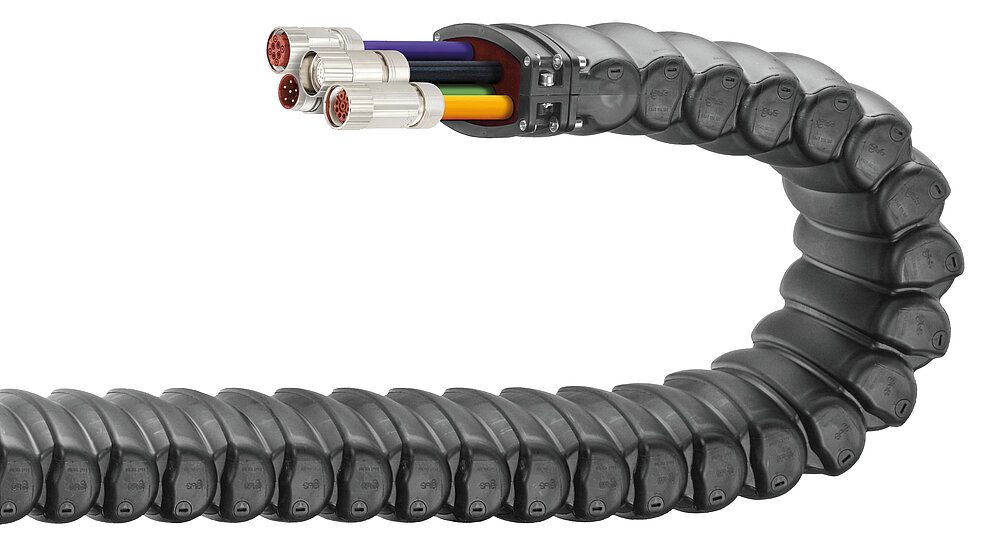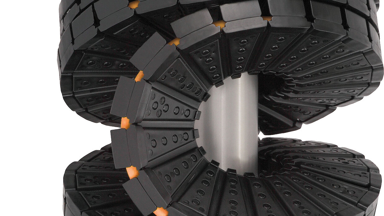 This plastic polymer energy tube enables safe energy supply and protects cables and hoses on dynamic apparatuses like tooling machines. The oval design prevents chips from becoming deposited on or adhering to the energy tube.