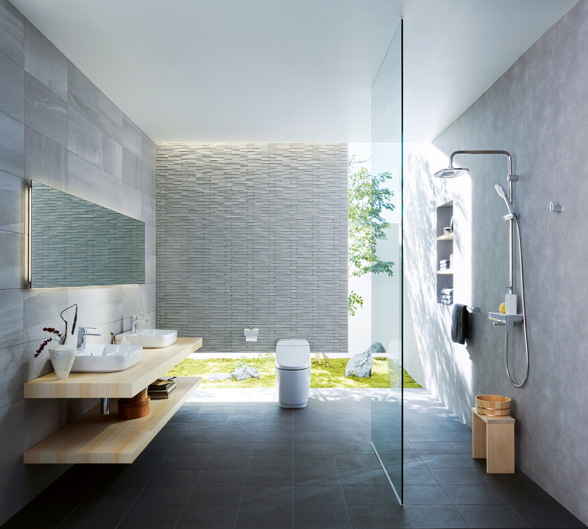 This design presents the S400 LINE by INAX, a manufacturer of bathroom fittings. One of the remarkable design features of this both simple yet also very elegant bathroom is the clever interplay of light and shadow. Mystic-looking rays of light penetrate through small windows and form different shades and shadows on the floor, walls and sanitary ware. This effect creates a sense of serenity and total relaxation.