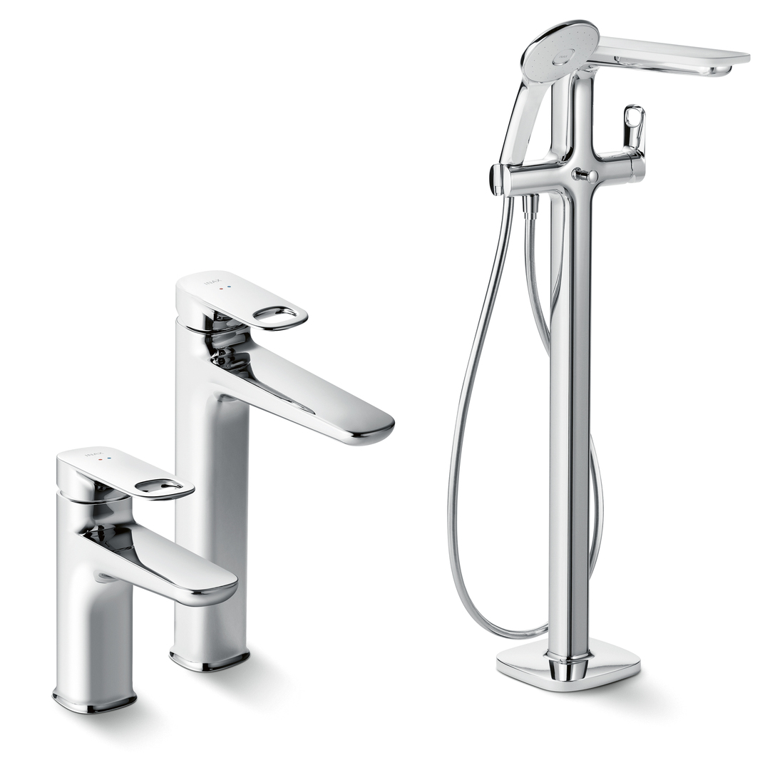 The levers of the S600 tap series are dominated by oval openings. They lend the basin mixers their characteristic appearance, complemented by purposefully placed blue colour accents. The free-standing shower system embraces the series’ gentle lines and blends harmoniously into the collection. Its flat water outlet protrudes far forward and, with its generous surface area, offers shelf space for shower and wellness accessories.