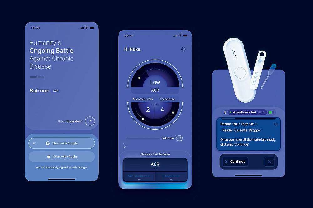 Saliman is a mobile app designed to empower Chronic Kidney Disease (CKD) patients in managing their kidney function and overall health. By evaluating the Microalbumin to Creatinine ratio from urine samples, a vital indicator of potential kidney damage, Saliman enables early detection and timely intervention, which is crucial for effective CKD management. Harnessing the power of AI, the app provides personalised health insights through a virtual doctor. This intelligent assistant analyses data, offers tailored advice, and helps users grasp their health metrics, delivering guidance suited to each individual's condition. Saliman’s comprehensive support features set it apart. Voice-guided navigation simplifies access to various functionalities, while the text-to-speech feature ensures that users with visual impairments or reading difficulties can engage with their health data. Realistic visual instructions guide users in collecting urine samples and utilising the app’s features. Saliman promotes proactive health management with continuous monitoring and reminders for regular health checks. Detailed health records allow users to track their progress over time and share critical information with healthcare providers, facilitating better-informed medical decisions. Saliman leverages cutting-edge technology to provide CKD patients with essential resources. Its blend of AI-driven insights, accessible design, and continuous support makes it an indispensable companion for those living with CKD. Red Dot Award: Design Concept | Concept | Service Design