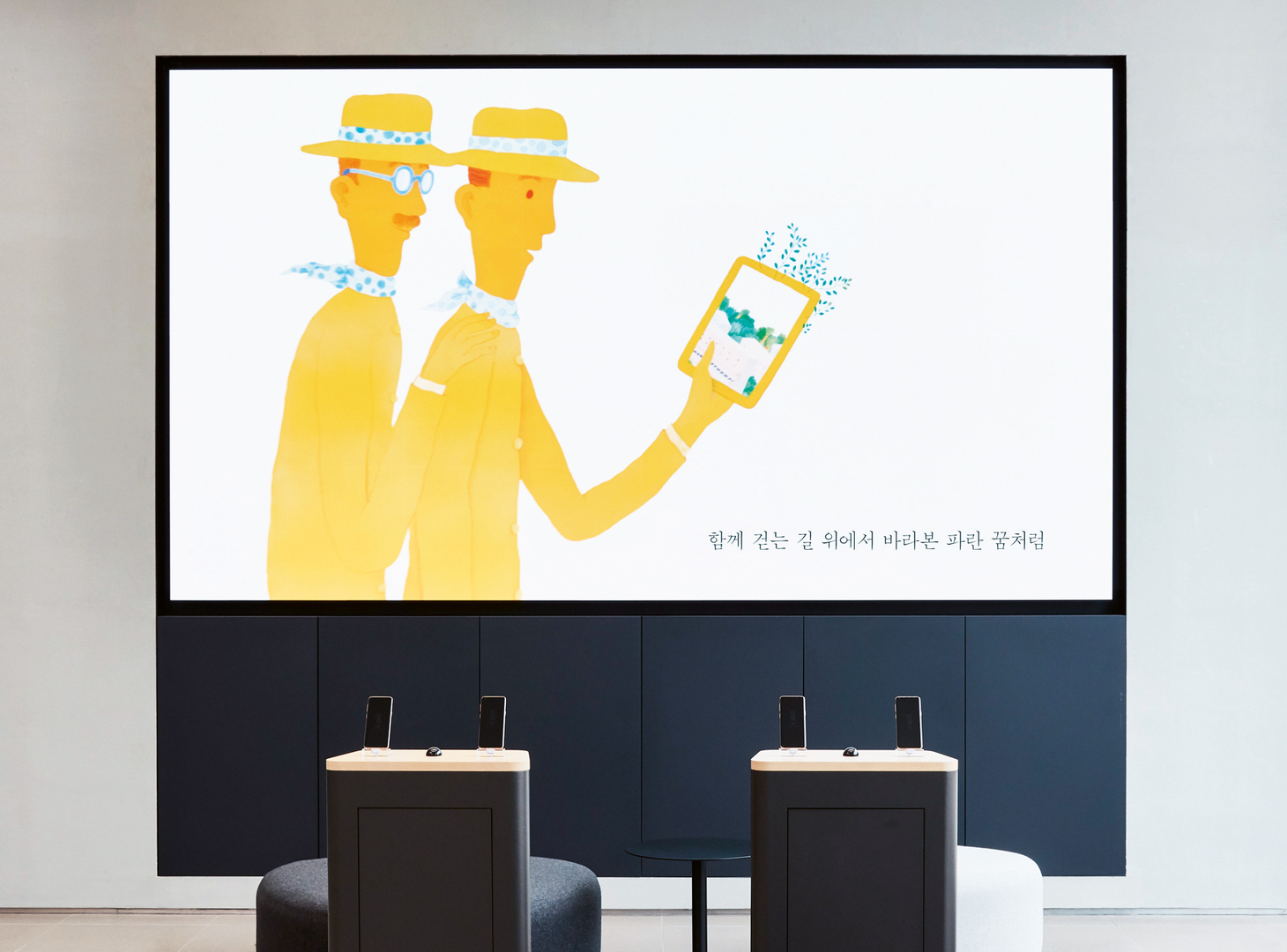 The illustrations of Lee Sung-Pyo decorate the walls of the newly opened Premium Store Samsung Digital Plaza, blurring the boundaries between a shop and a gallery. Under the motto “wind (hope)” – words that are written in the same way in Korean – poetry and refined illustrations are effectively combined. In the form of large-scale works of art, motion graphics, banners and posters, these works create a friendly and open atmosphere, adding artful nuances to the store.