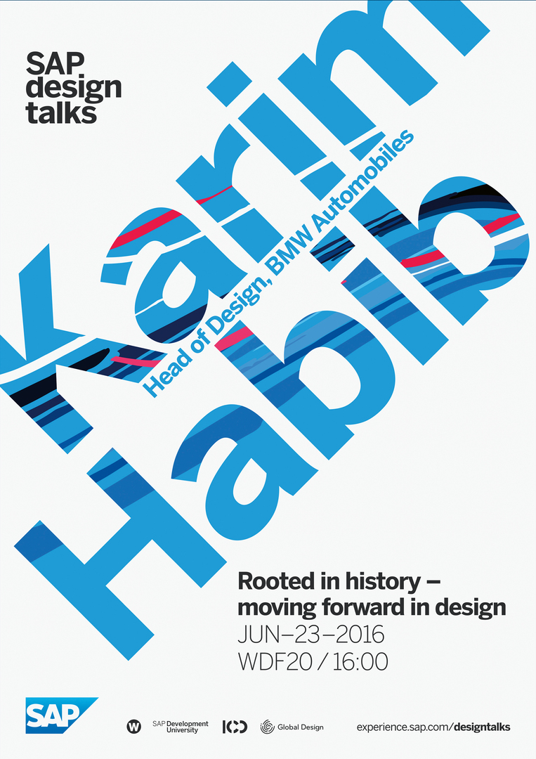 The poster campaign for the event “SAP Design Talks” is an expression of a holistic design concept that seeks a high degree of consistency. The concept has been implemented using a 45-degree angle as a constant key element, reflecting the angle visible in the official SAP logo. This provided freedom to create an individual design tailored to the guest speakers, while still ensuring a high degree of brand recognition throughout the lifespan of the series. The posters have been created and deployed so far at four major locations across the globe.
