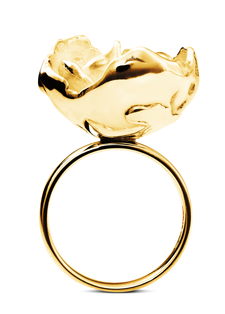 The organic shape of this jewellery ring of recycled gold is inspired by both a particular type of peony and its namesake, actress Sarah Bernhard. Similar to the natural flower itself, the ring combines in itself both delicacy and strength. Depending on the angle from which it is viewed, its appearance changes. The lively and at the same time fragile-looking piece of jewellery is made using various goldsmithing techniques.