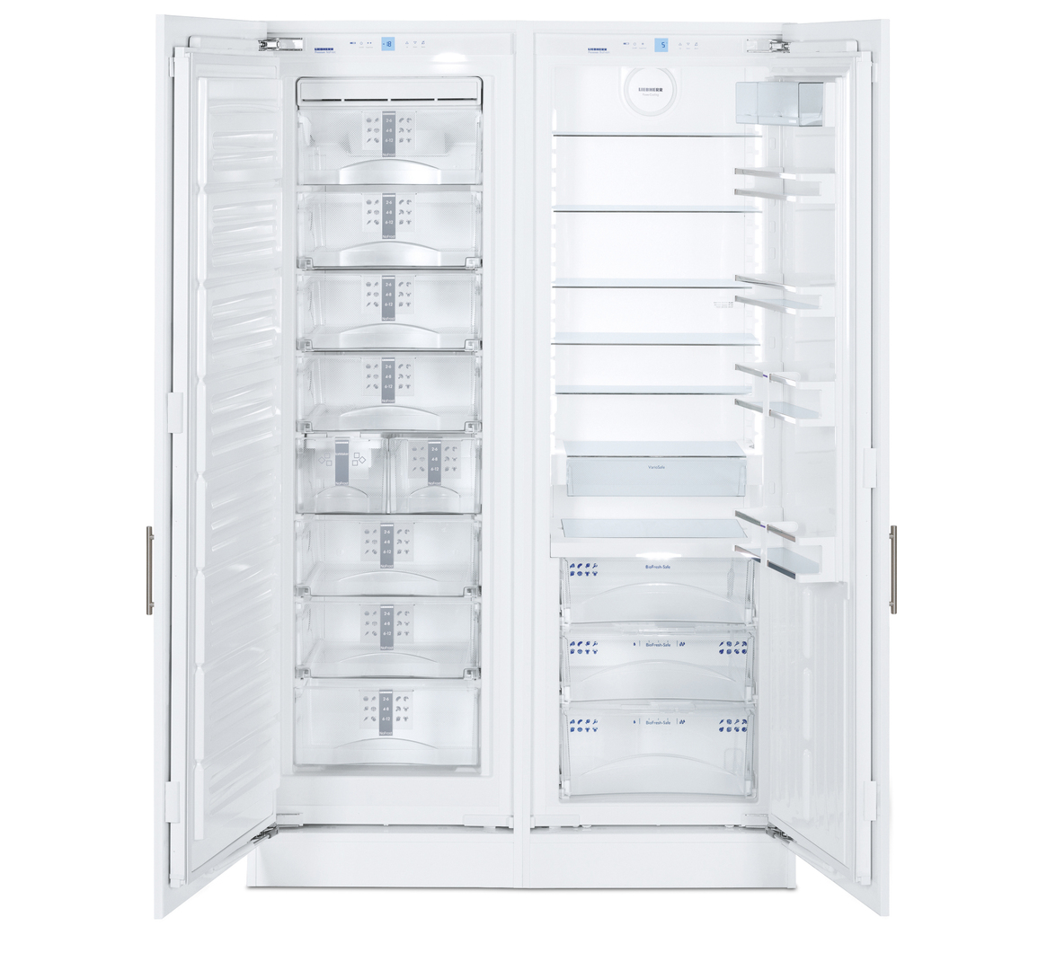 This side-by-side combination of refrigerator and freezer provides ample room for storing food in various climate zones. When the door is opened, the integrated LED light column switches on and illuminates the refrigerator interior. Thanks to transparent dividing elements, the design of the interior is light and orderly. Smooth-running, self-retracting telescopic rails and drawers with damper closing provide ease for daily use.