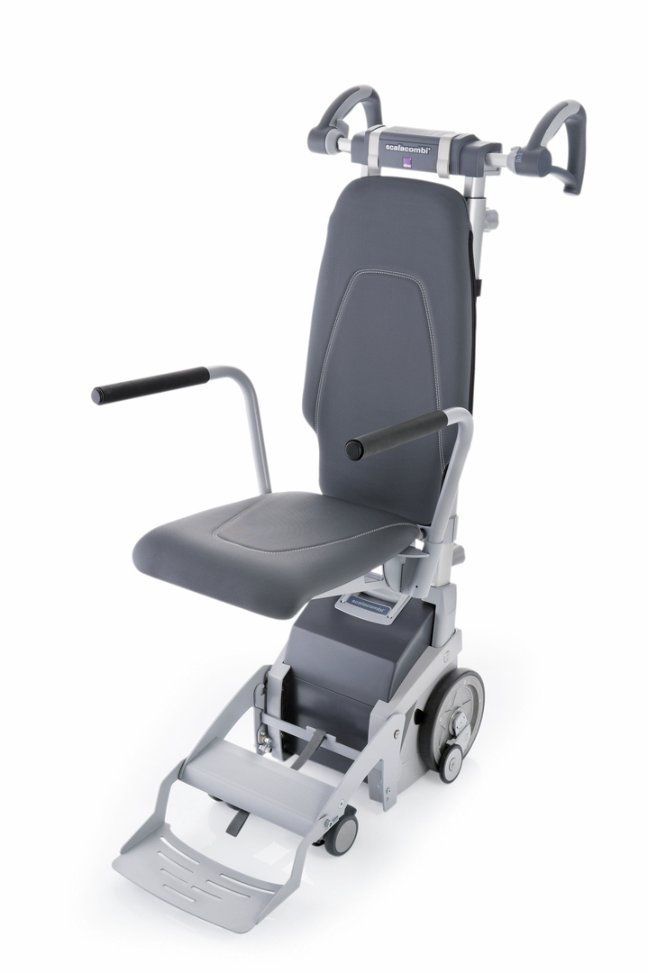 The scalacombi is a mobile stair climber which masters any staircase with little effort thanks to its patented climbing mechanism. The development focused particularly on an ergonomic design, for instance on a handle unit that can be adjusted in both height and width to guarantee an ideal transmission of force. By means of a folding mechanism, the integrated seat unit can be folded up to save space and, if necessary, the vehicle can be disassembled entirely.