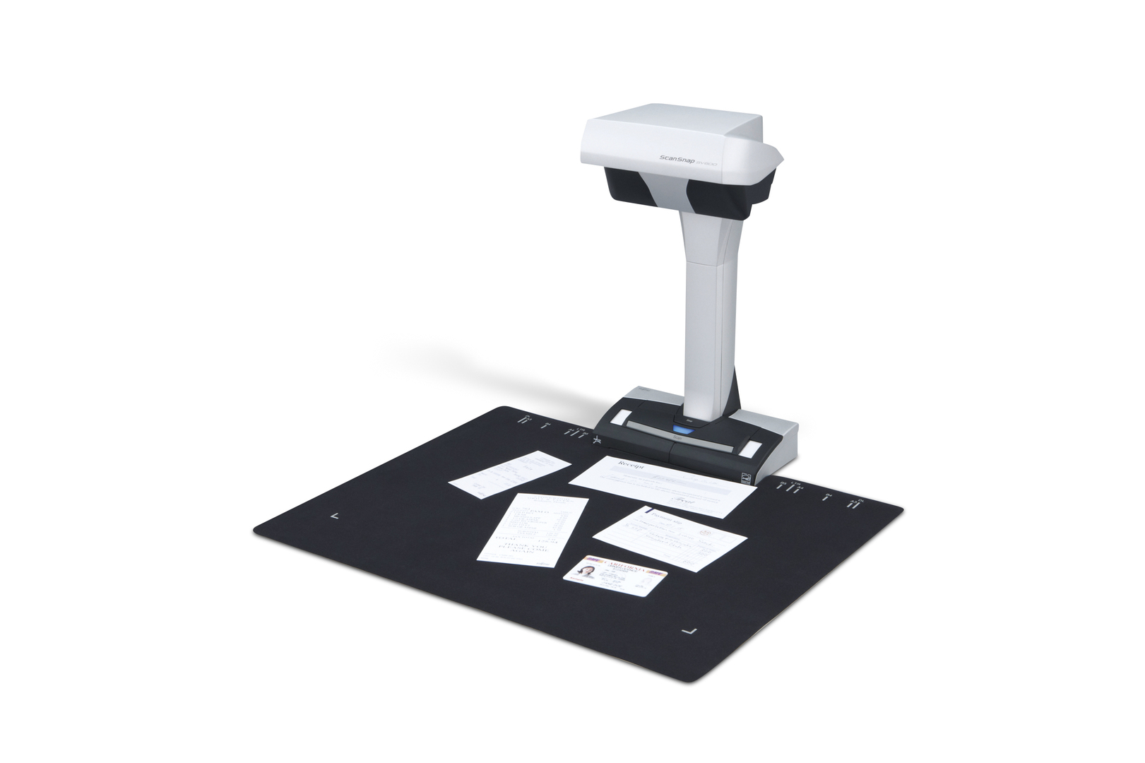 The ScanSnap SV600 document scanner is capable of contactless scanning. Items are placed under the elevated scanning head and captured at the push of a button. The device digitalises various objects, such as bound or stapled documents up to A3 size, and also delicate originals or objects up to 3 cm thickness. The scanner likewise produces high-quality images from curved templates. With the new continuous scanning feature, the device automatically captures the next page as soon as the page is turned.