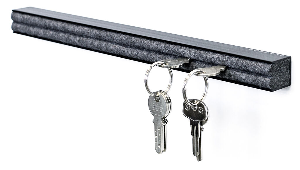 Thanks to this simple key rack users will always be able to find their keys as they can easily be inserted into the felt. Optional extras on the design ledge such as rings, buttons or test-tube holders offer space for glasses, flowers or jewellery. The combination of aluminium and replaceable designer felt, which is made of pure wool and is available in 20 different colours, offers a range of different value-added design options.