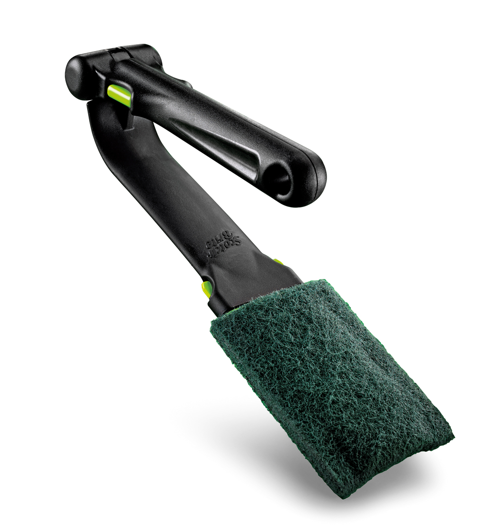 This cleaning device for fryer and kitchen simplifies cleaning in industrial kitchens by means of an adjustable handle, which ensures that the hand remains at a distance from hot surfaces while simplifying the cleaning of areas which are difficult to reach. The device holds changeable cleaning pads in three grades of abrasion and can withstand temperatures up to 350 degrees Fahrenheit (about 177 degrees Celsius).