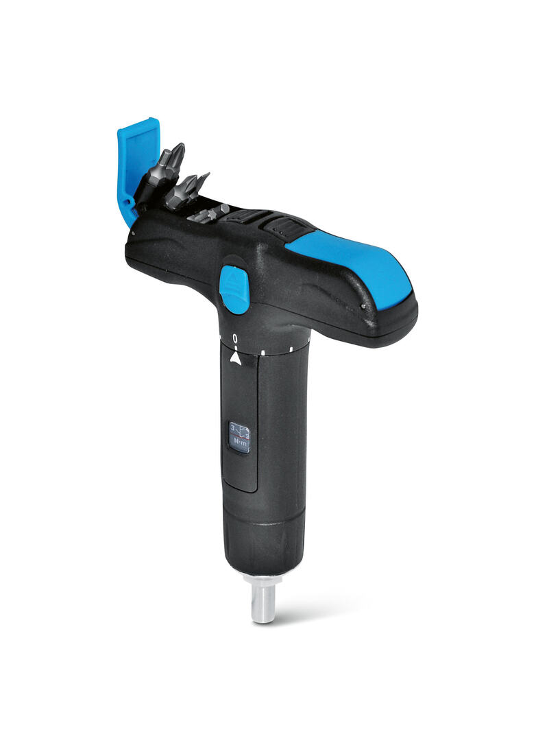 This torque screwdriver is made of high strength materials and can be held well thanks to its ergonomically designed T-handle. An alloy steel pawl increases its stability and reliability. It can hold 12 different bits and is factory calibrated to ± 6 per cent. The product maintains long-term accuracy by means of a new mechanism and meets the requirements of ISO 6789:2017 and ISO 9227 (NSS). The torque value can easily be read on the numeric display.