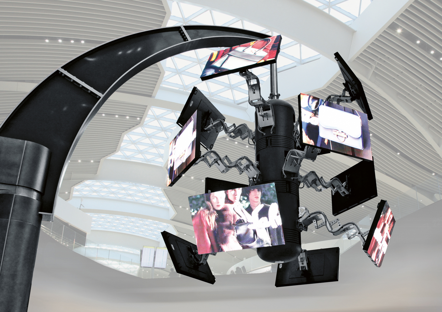 The ScreenFLITE is a novel digital signage system that is installed with a suspension arm in the ceiling range or freestanding in the centre of a hall, for instance in airports, train stations or shopping centres. It consists of 12 LED displays that can be arranged in different formations. Two, three, four or six displays can form figures to show content on a large surface. Alternatively, each display can individually present content. Static or video content may be played back synchronously with the movement of the entire ensemble.