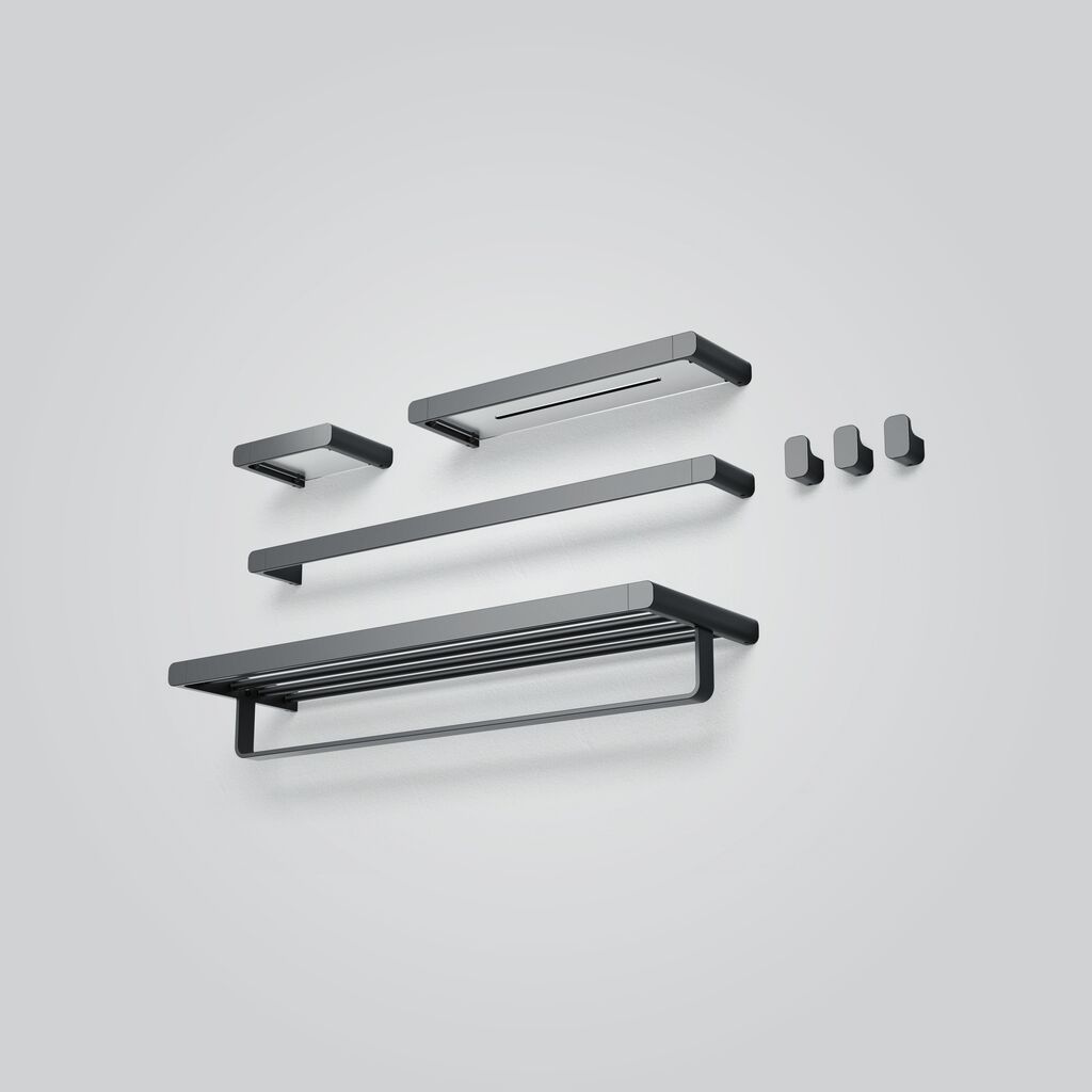 The appearance of the SE series is defined by an interplay of simple geometric shapes. Characterised by rectangular elements with clear edges and soft round lines, the accessories match harmoniously in terms of look and functionality. The shelves, towel racks, handles and hooks can be freely combined, offering users individual detail solutions. The matt black surfaces lend these bathroom accessories both unobtrusive aesthetics and an elegant appeal.