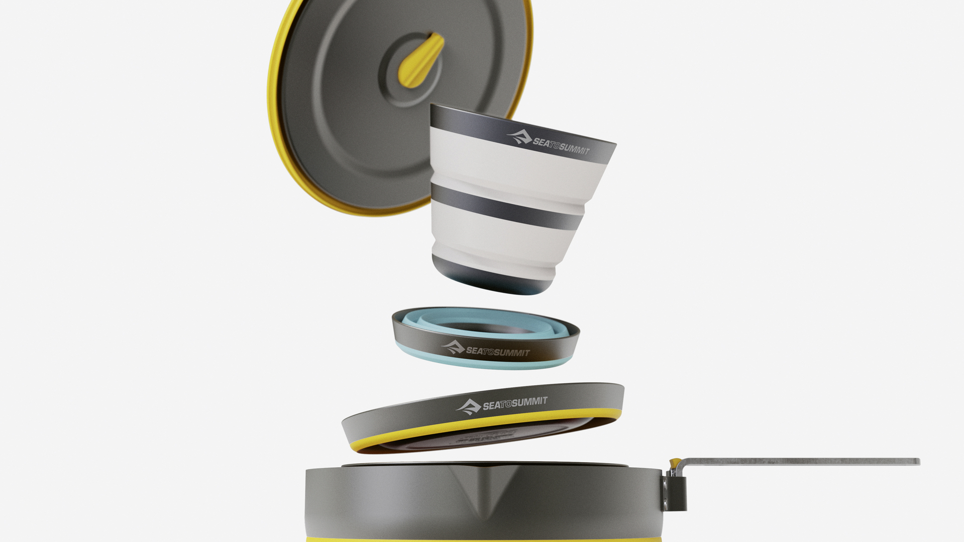 The Sea to Summit: Frontier Range includes durable and lightweight camping gear in a comprehensive set. The unique folding design allows for stackable and safe storage. While food-safe silicone and fibreglass-reinforced nylon have been used for the tableware, the pots have a robust ceramic coating. Removable click-safe handles and the practical option of attaching the lids to the rim of the pot during cooking also caters for confined space use.