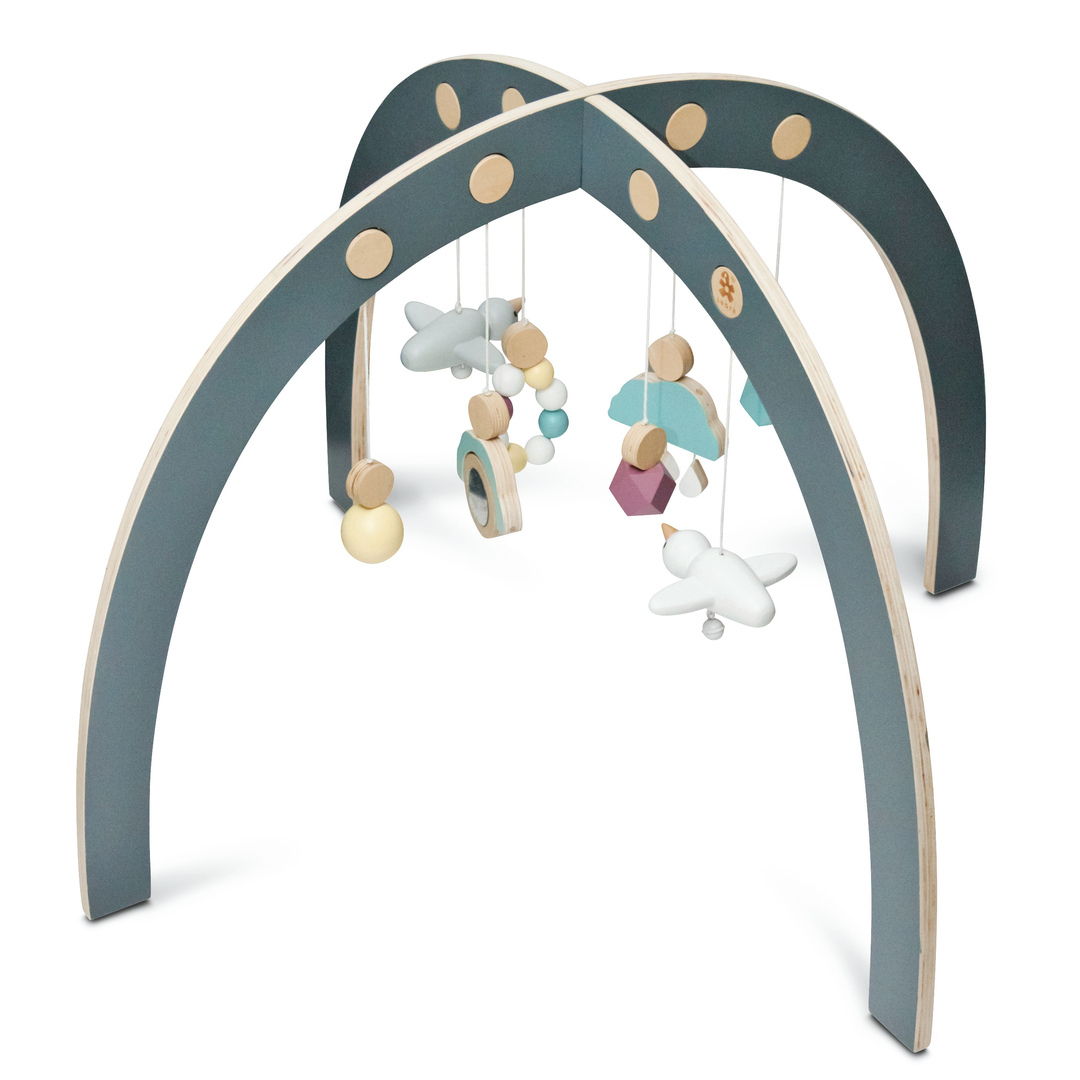 Sebra Baby Gym is made of wood and has an arch design which surrounds the child on four sides, thus creating a safe, sheltered atmosphere. Eight different toys, among them a mirror, two birds with little bells and a cloud with raindrops attract the baby to observe, grasp, learn and discover and in this way promote the development of its fine motor skills and hand-eye coordination.