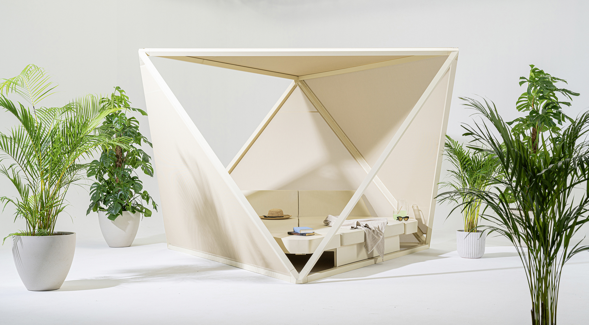 Seclude is a contemporary daybed that provides a secluded, luxurious oasis, offering protection from the sun without blocking out the ambiance of the surrounding landscape. The airy construction in the shape of a hexagonal prism frames a comfortable double mattress with three side tables and a sun canopy. The open sides offer a unique view of the scenery. Inspired by Mediterranean landscapes and plants, the designers chose colour options that give this piece of outdoor furniture a natural appearance.
