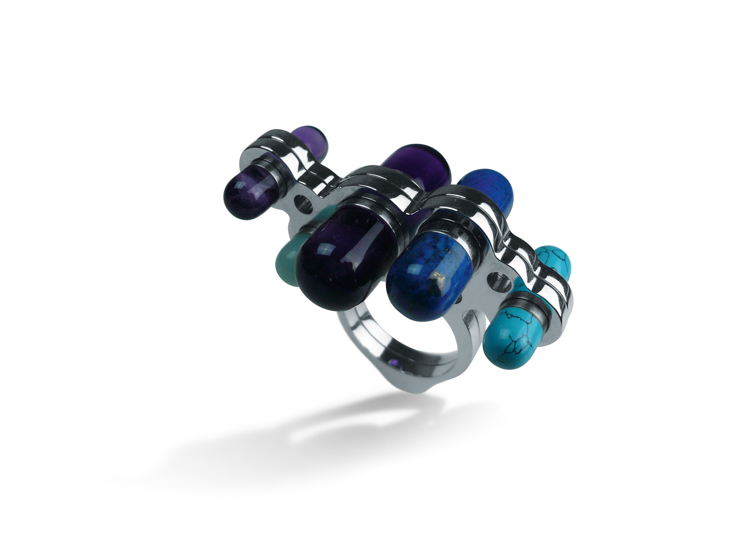 This ring set consists of two components: the main stainless-steel ring and various capsules. The latter are available in three sizes and different materials, such as gemstones, metal and wood, and can be easily attached to the main ring. The two halves of the capsules themselves can even be combined, thus allowing for an unlimited range of possible designs.