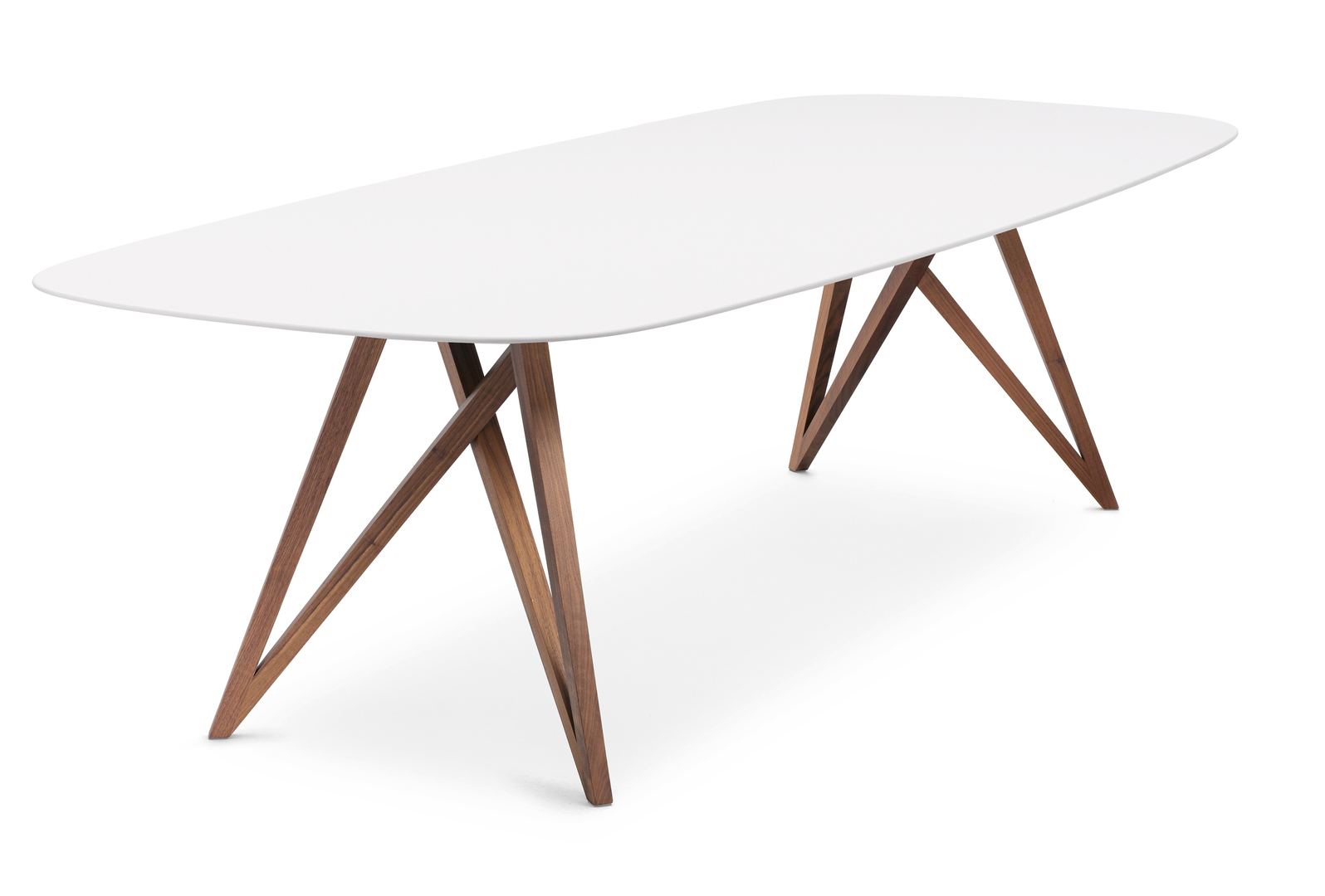 The Seito table conveys a playful lightness with the harmonious balance of lines, angles and surfaces. The material selection in particular underlines the dramatic understatement. The table top, made of white quartz, is carried by a base made of elegant nut wood. The filigree table legs are an expression of clear geometry, providing users with generous leg room. Furthermore, the impressively glossy surface of the table is highly pleasant to the touch.