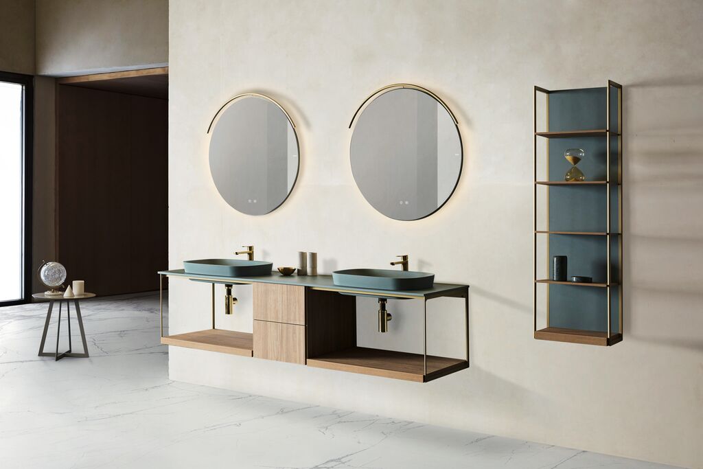The character of the SEN bathroom furniture collection is marked by a high-contrast combination of materials in the form of appealingly combined wood and metal elements. Shelves and sideboards feature a lightweight and open design, forming an expressive counterpoint to the closed cabinet and drawer elements. A sophisticated surface and colour design, as well as the embossed metal profiles, lend the furniture a special sensory dimension. The versatile and functionally sophisticated elements skilfully meet individual storage and organisation needs.