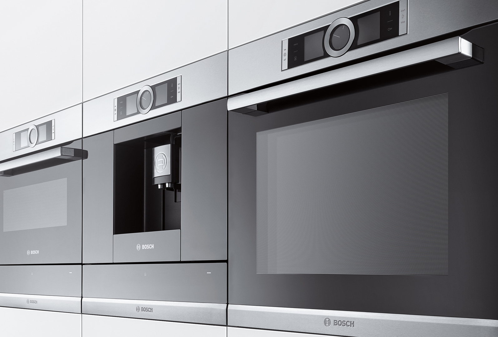 The striking feature of this interactive built-in appliance range is the central control ring located in the centre of the high-resolution TFT display. All automatic programmes and functions such as steam cooking or microwave heating can be selected quickly and simply via this control. Operation is intuitive, and cooking is supported by sensor technology. The front design is purist and clearly structured; the combination of black glass and stainless steel elements lends professional aesthetics to the appliances.
